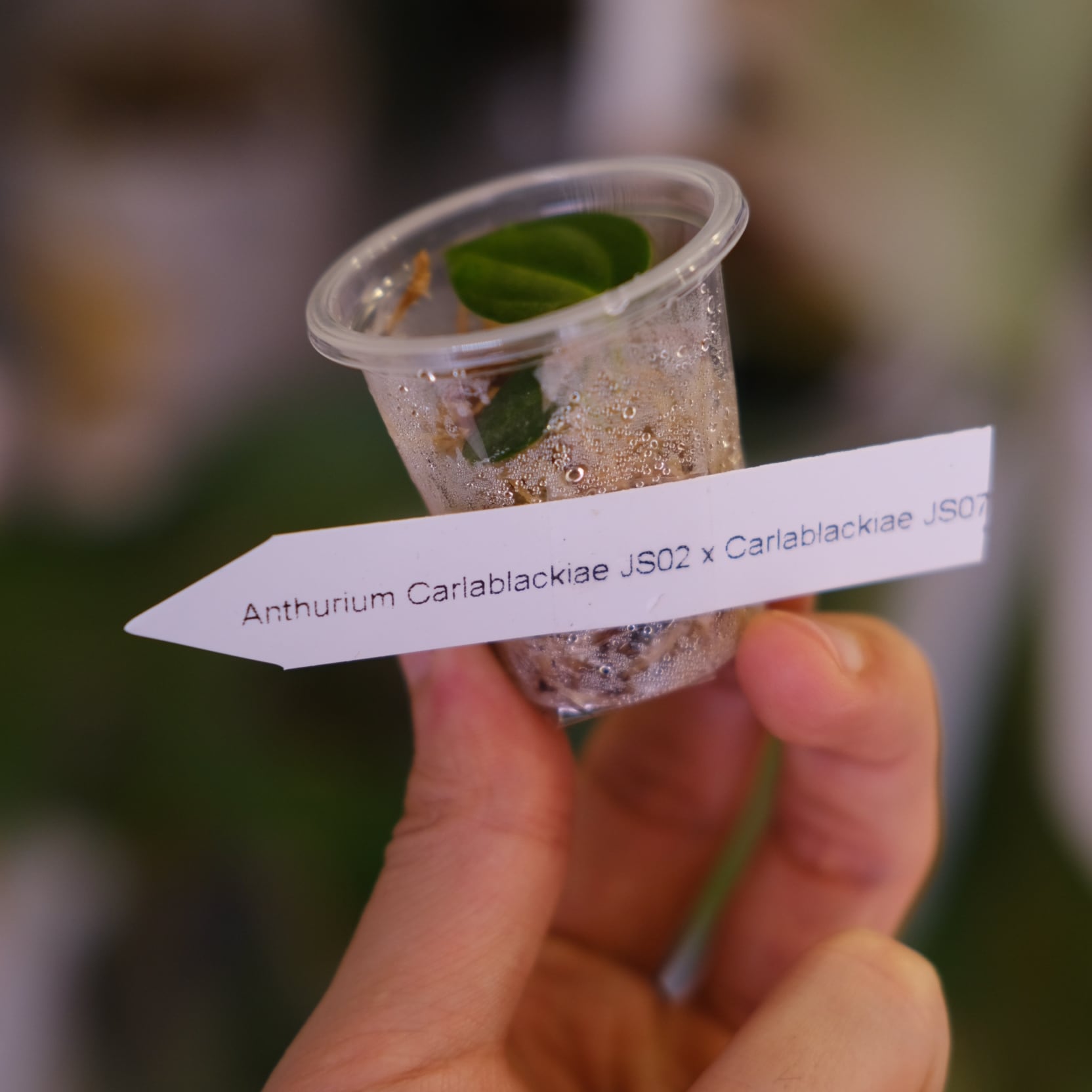Anthurium carlablackiae JS02 × carlablackiae JS07 は、carlablackiae の形質を高純度で引き継ぐことを目的とした同種内交配の実生個体です。野生種由来のシャープな葉形、深い葉脈、引き締まった株姿といった特徴が、比較的安定して現れます。