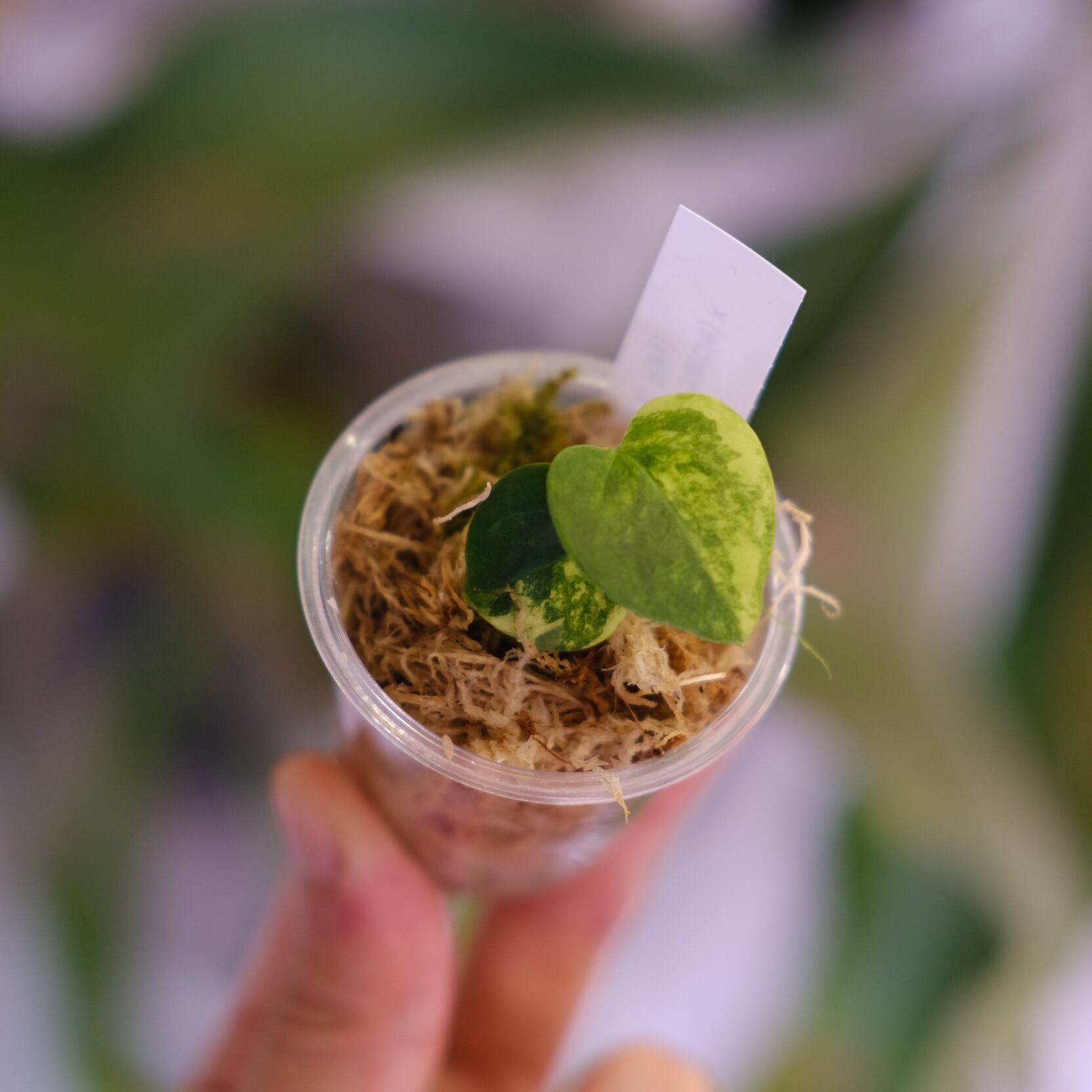 母系は Papililaminum variegated の葉形と質感に、Crystallinum marble の装飾的な葉脈表現を加えた系統です。父系は Dressleri による骨格とサイズ感、X-Ray の太く白い脈構造を掛け合わせています。質感・脈構造・葉形のいずれかが強く現れる可能性を持ちます。