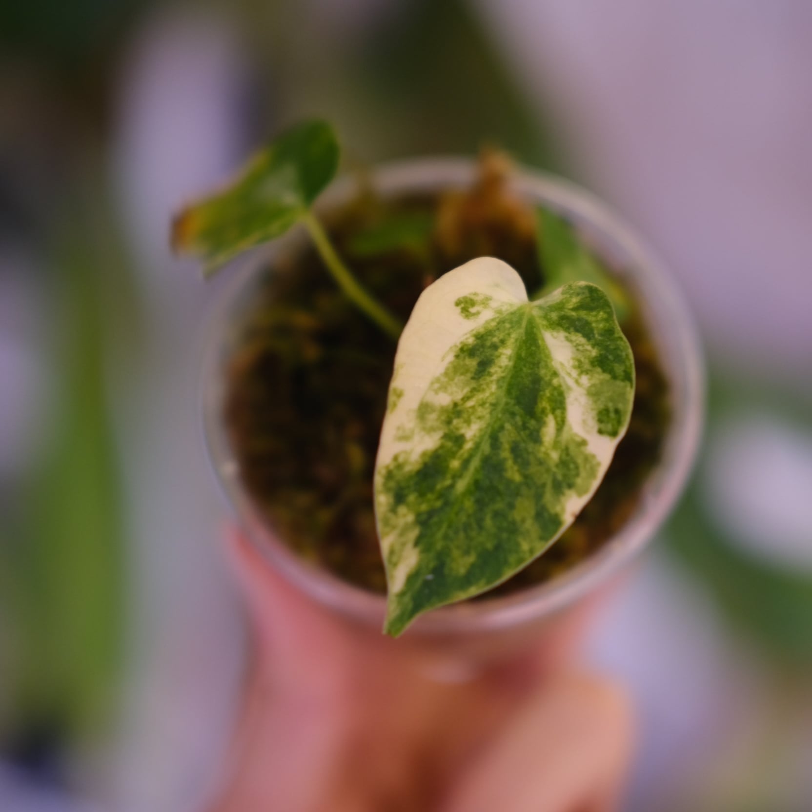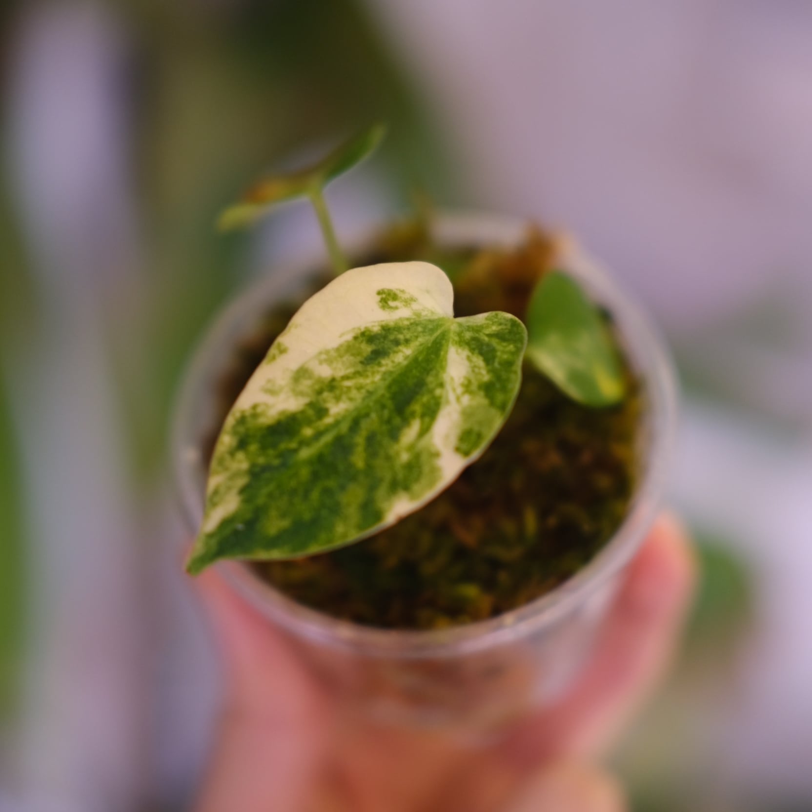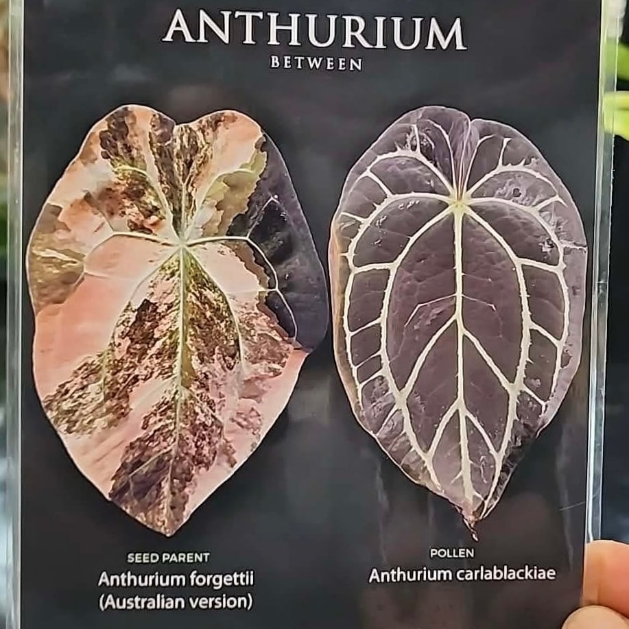 forgetii “Australia version” は、丸みを帯びたシールド状の葉と、クリーム色〜ピンク色に変化する美しい斑が特徴的です。一方、carlablackiae は細長く縦に伸びる葉形と、深く沈む葉脈構造を持つ野生種系統です。本交配では、両者の特徴が中間的に現れ、極端に丸くも細くもならない、引き締まった葉姿が出やすい傾向があります。