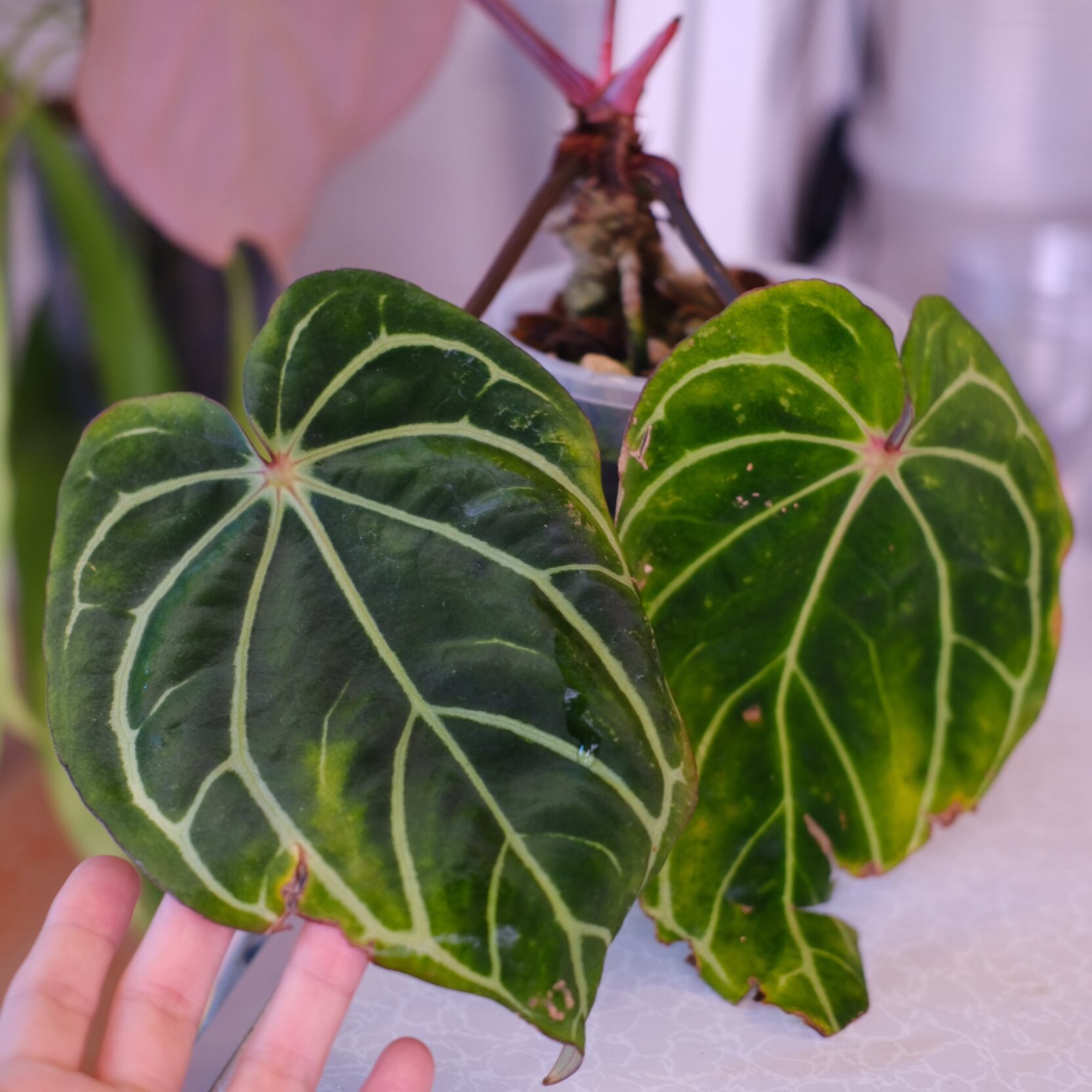 シルバーやライトグリーンの葉脈がダークグリーンの葉の上に浮かび上がり、まるで芸術作品のような美しさを持ちます。またアンスリウムの中でも大きく育つことが特徴です。