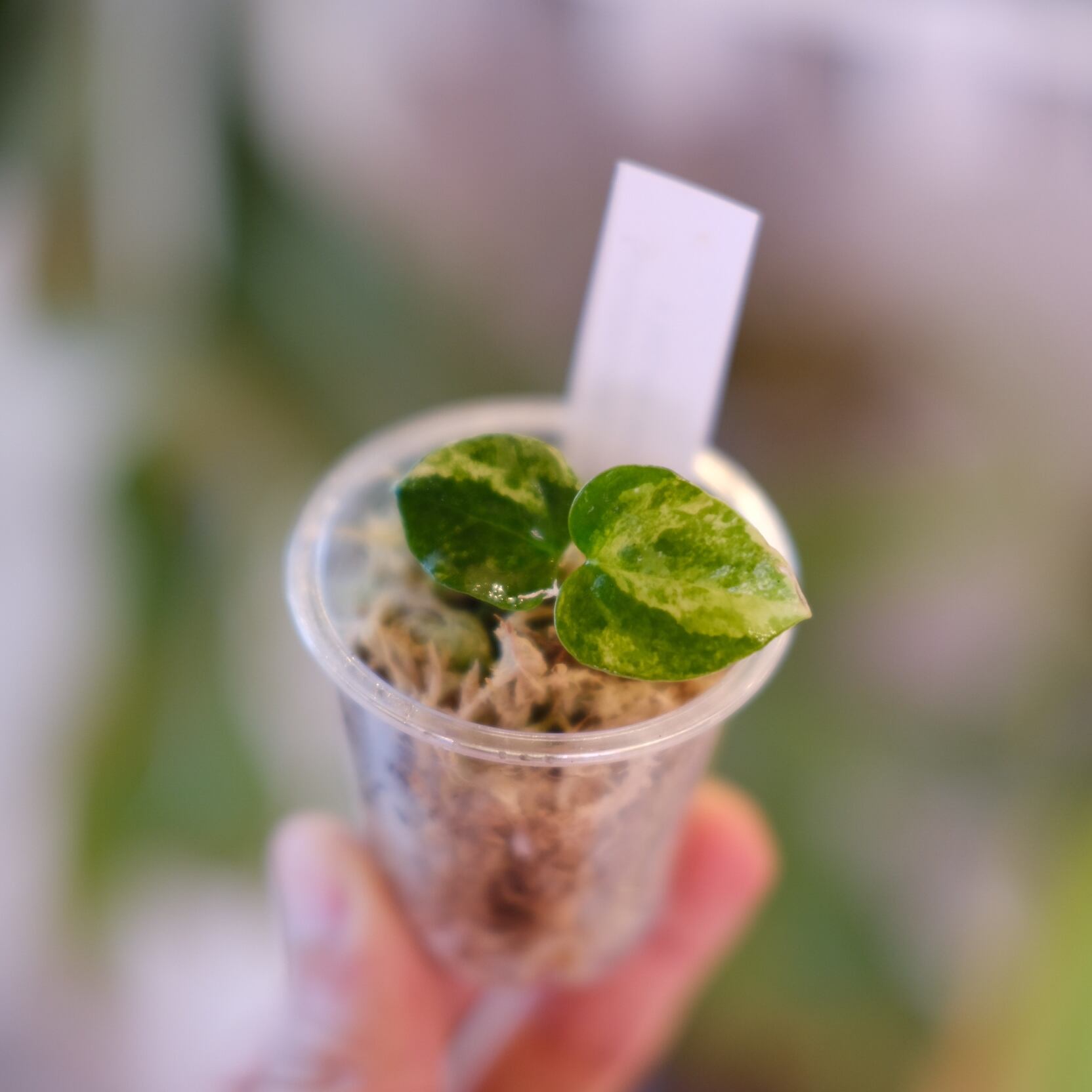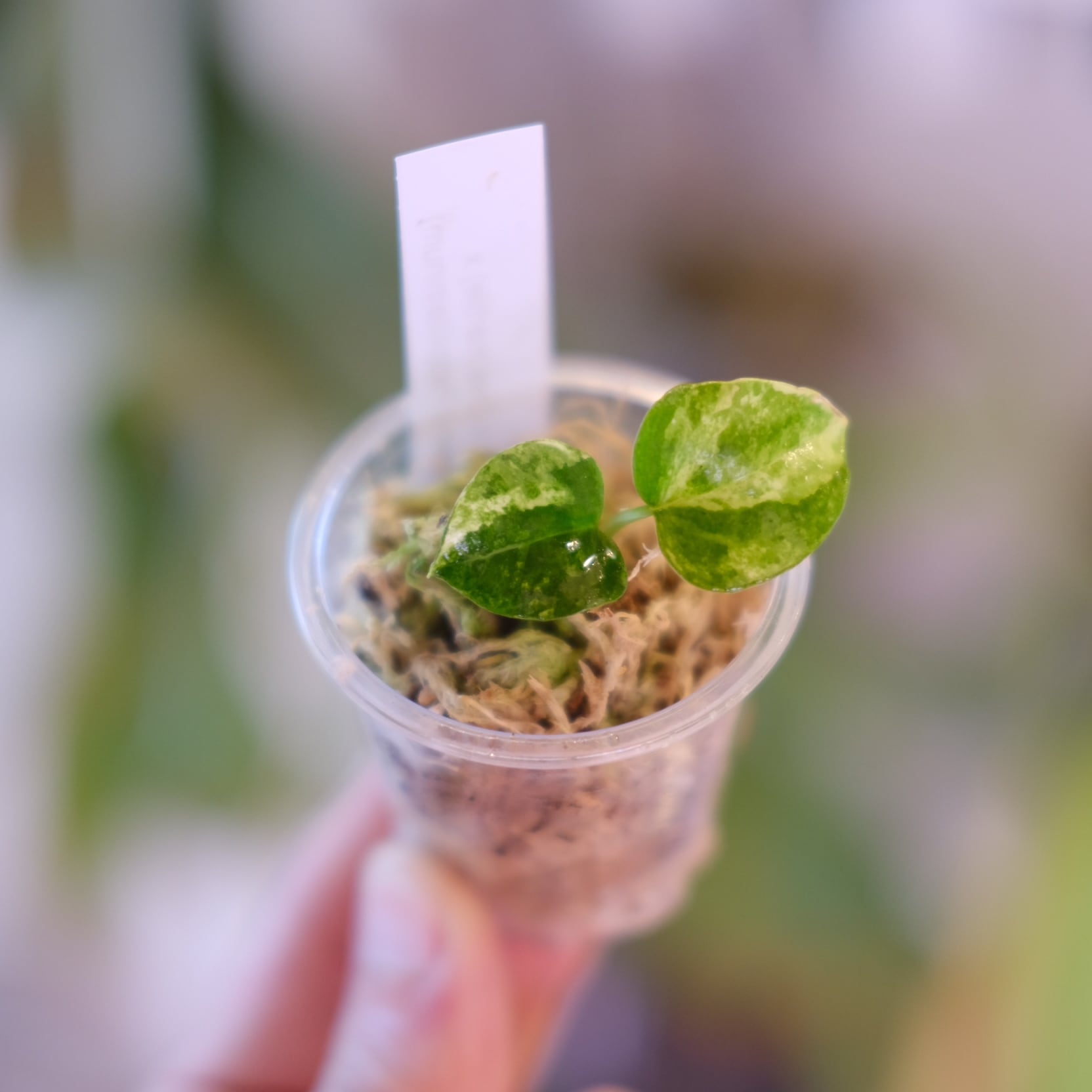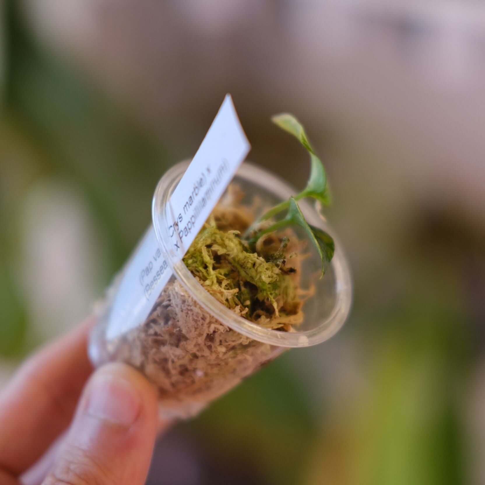 母系の Papililaminum variegated × Crystallinum marble は、ベルベット質な葉脈構造に美しい斑入りを持ちます。