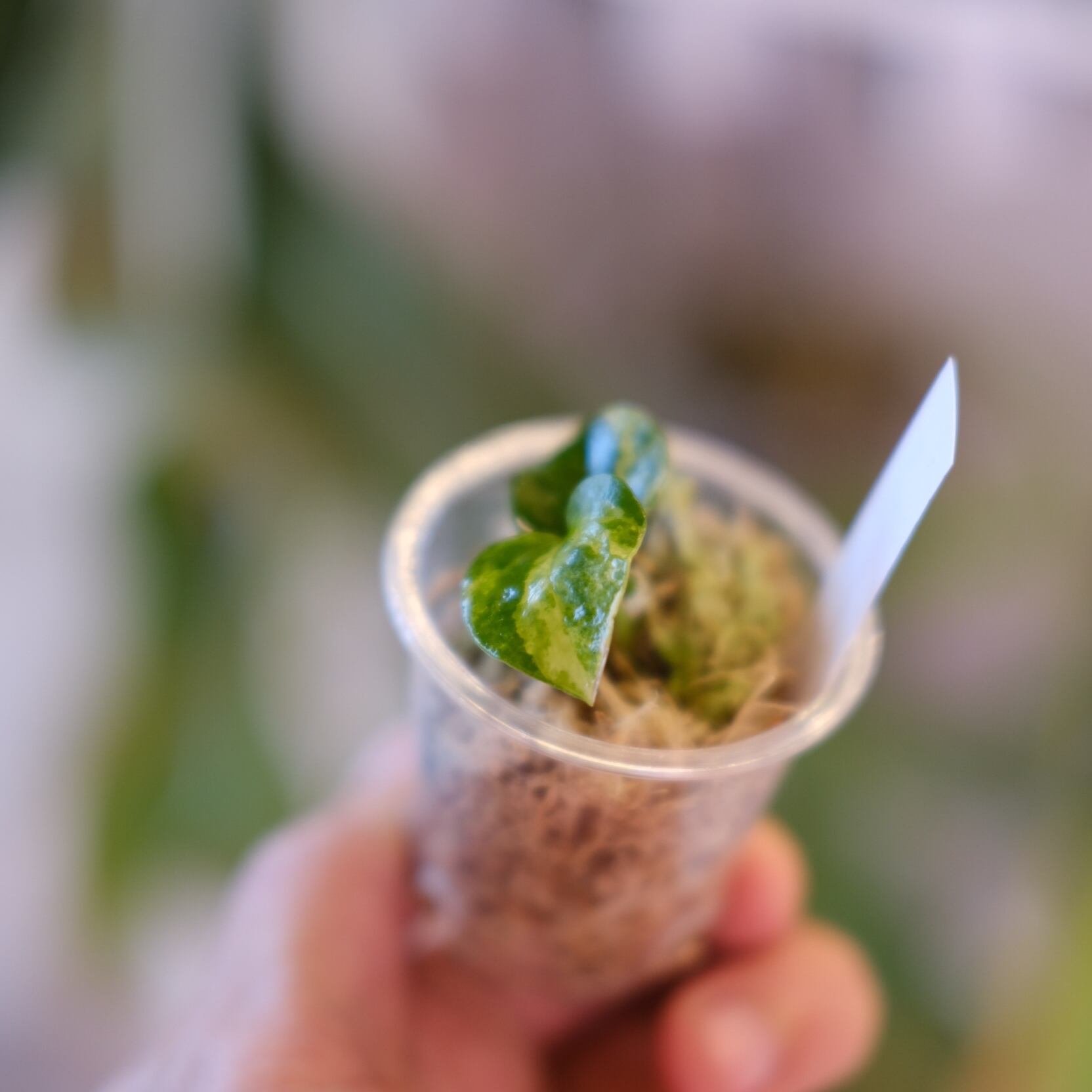 本交配では、葉形は中庸、質感はベルベット寄りに出やすく、成長とともに脈の立体感が増す可能性があります。