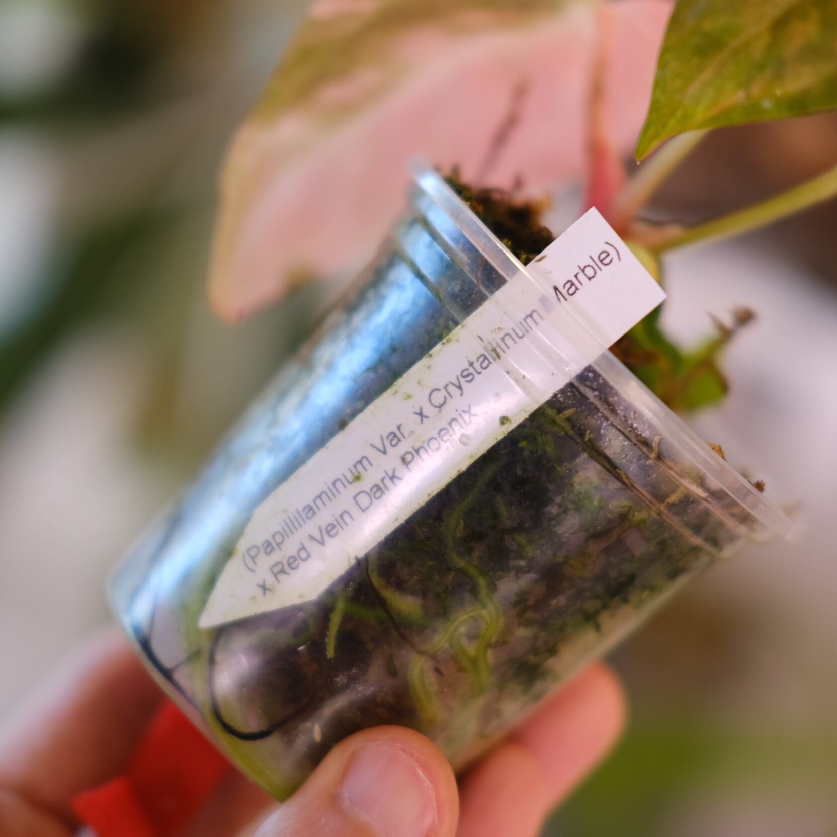 (Papillilaminum variegated × Crystallinum Marble) × Red Vein Dark Phoenix の交配実生個体です。ベルベット系統に赤脈表現を特徴とする Dark Phoenix 系統を掛け合わせたハイブリッドとなります。