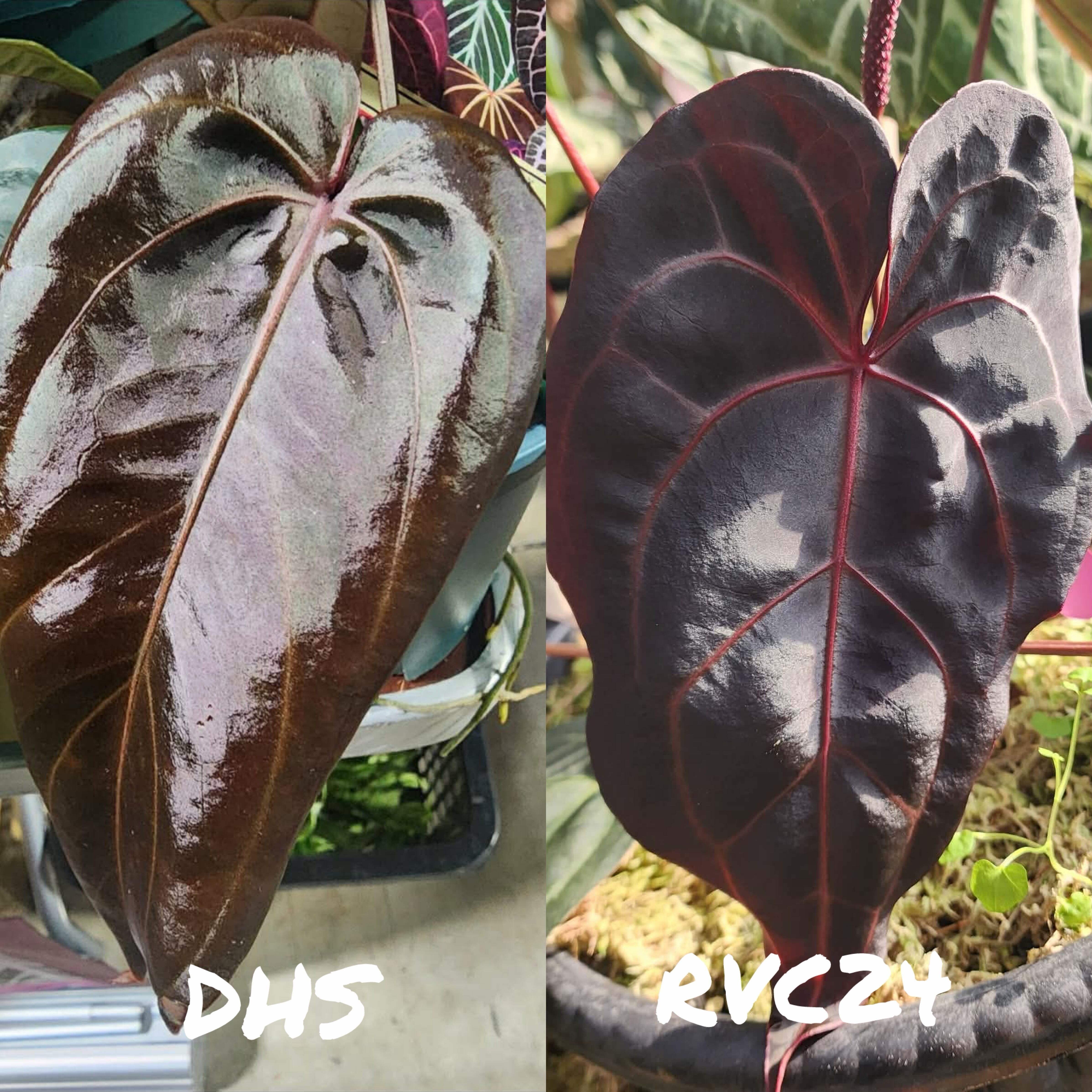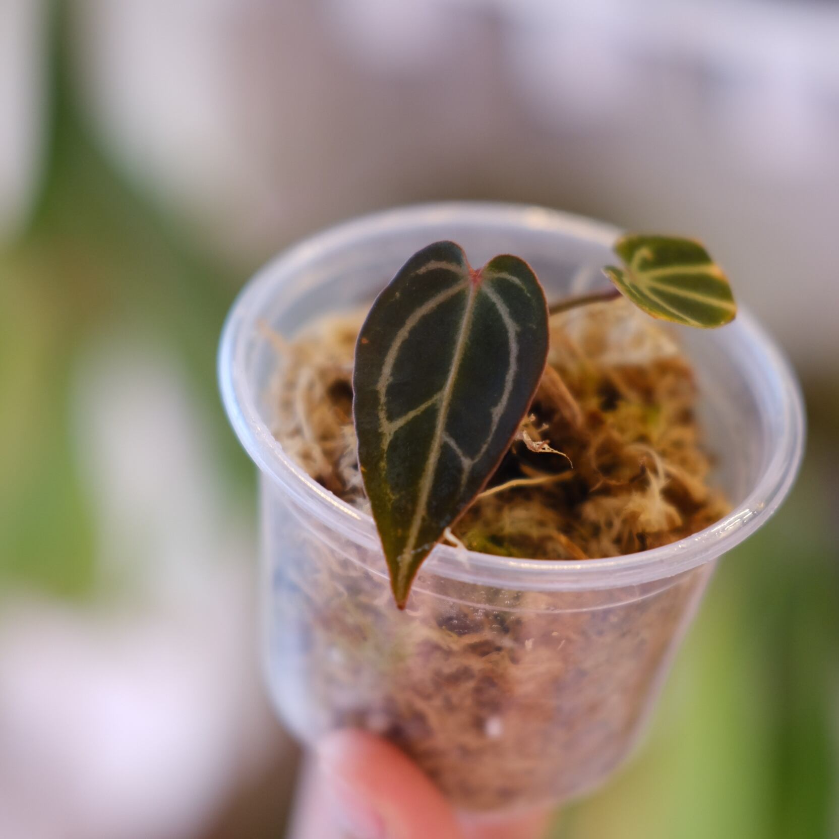 Anthurium ‘Dark and Handsome 4’ × Anthurium RVC24 は、ダークトーンのベルベット葉と赤系葉脈表現を組み合わせた交配実生です。派手な装飾性を狙うのではなく、葉色の深さと質感、色調の変化を長期的に評価する構成となっています。