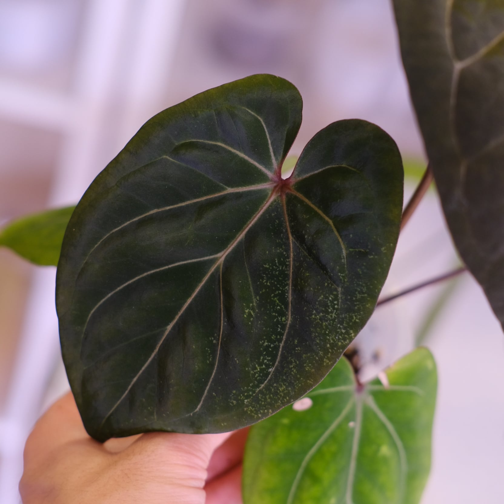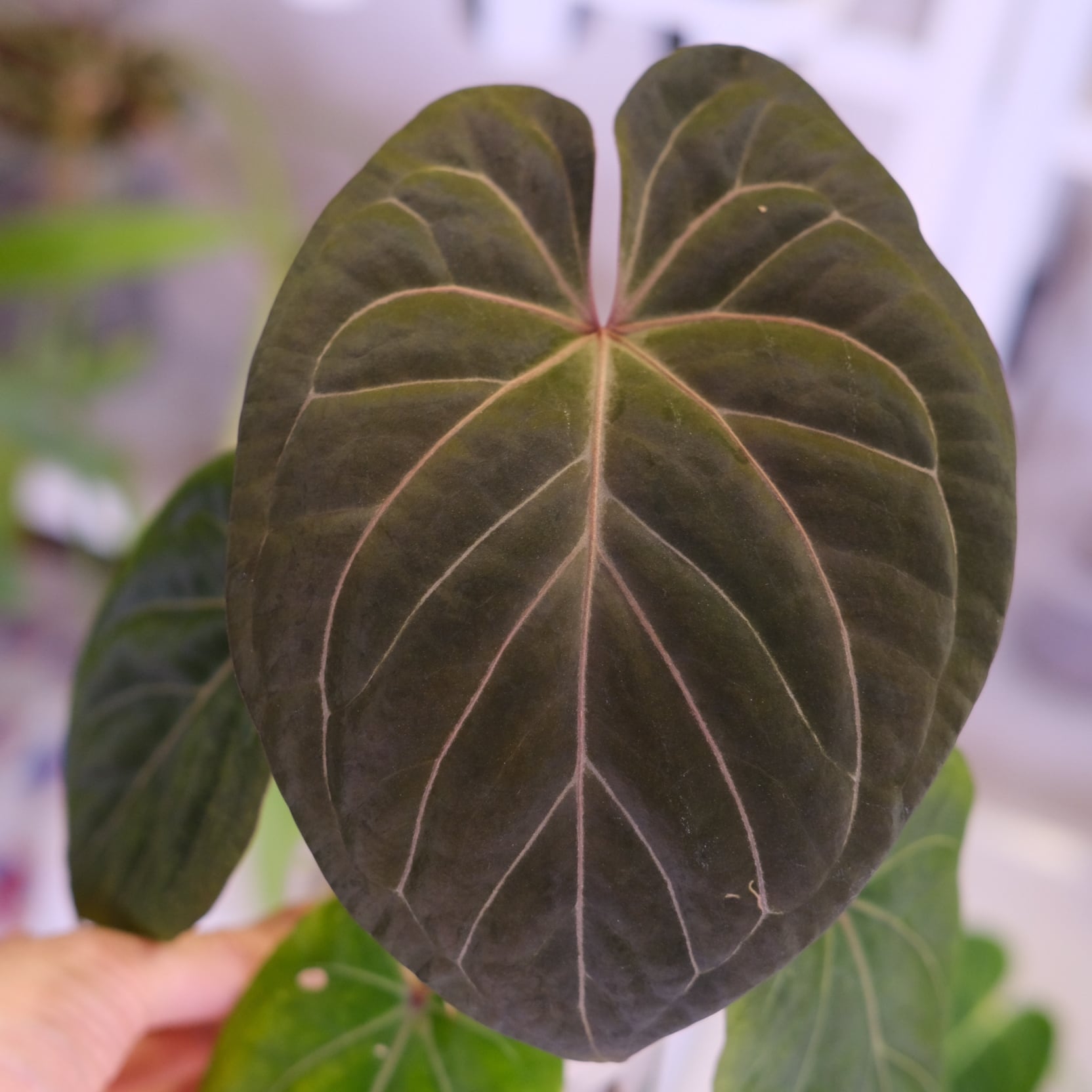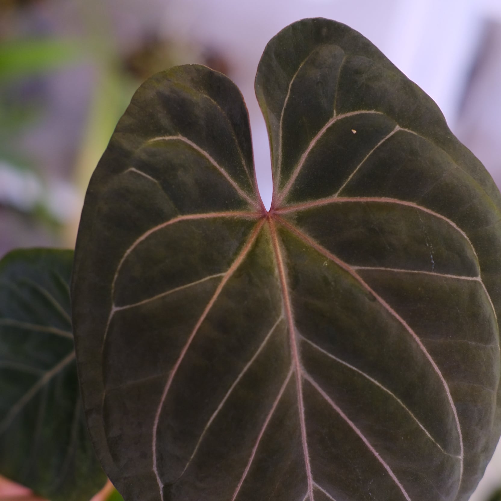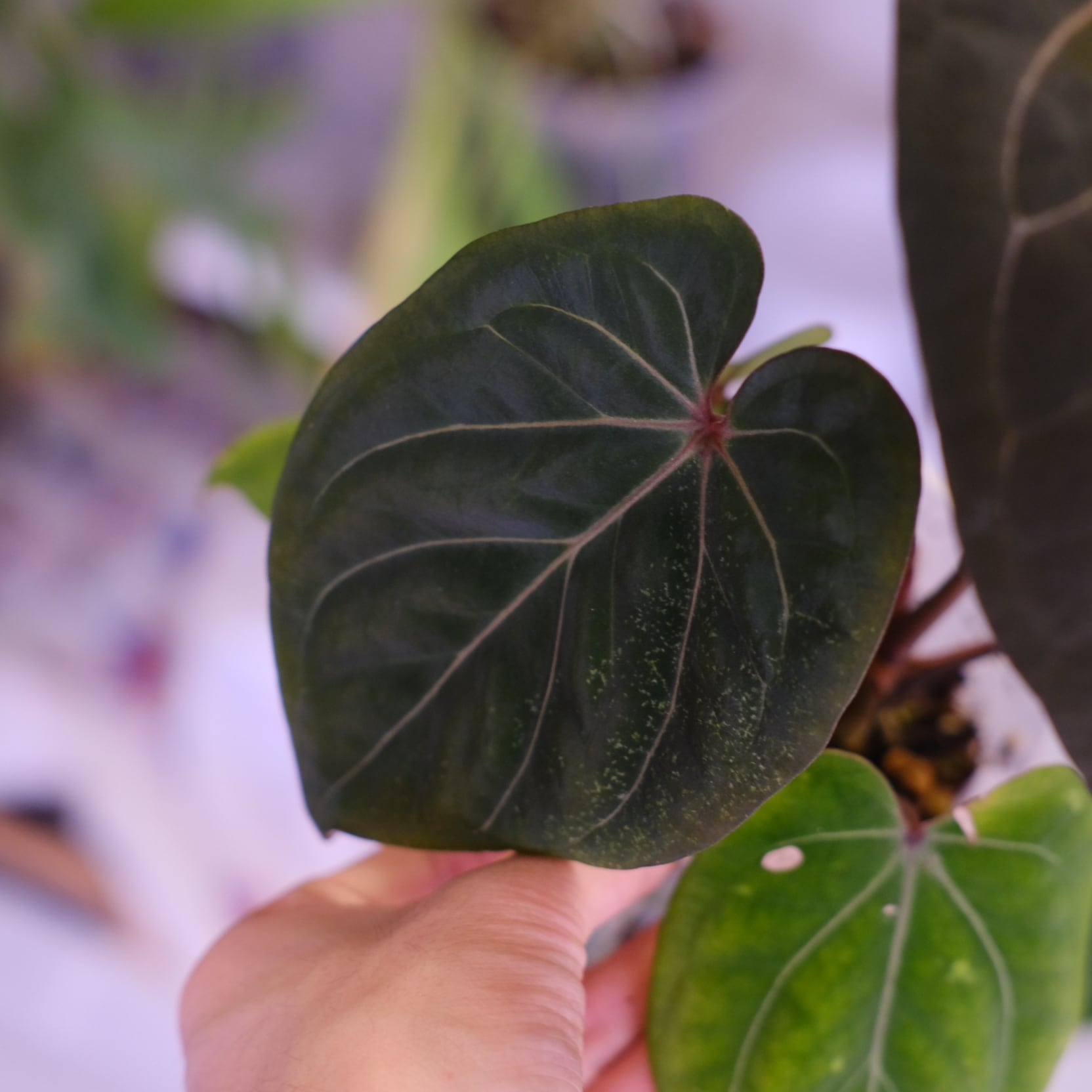 アンスリウムの希少種「KOS × Michelle」のハイブリッド種です。Anthurium King of Spadesの深みのある色が強調されつつ、Anthurium Michelleの赤みのあるは脈が入った美しい新芽を展開しています。