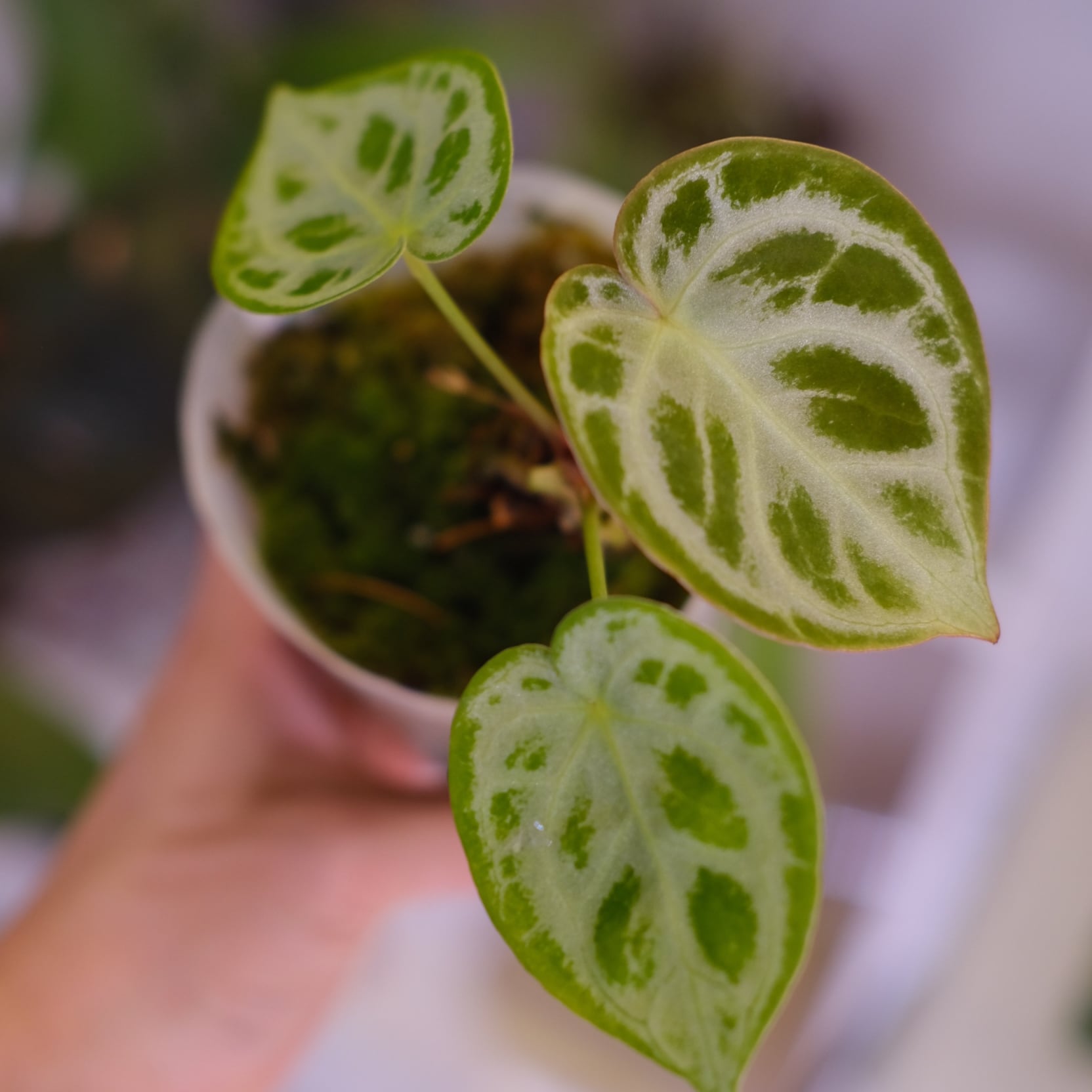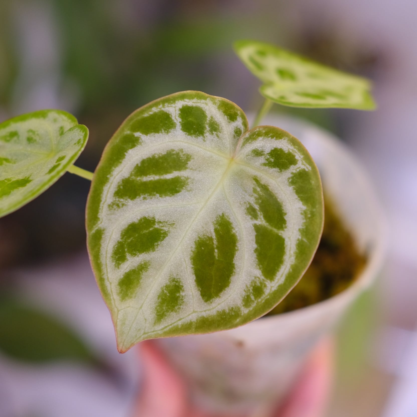Anthurium Dorayaki × Anthurium Silver brush の希少なハイブリッドです。ドラヤキのぷっくりした可愛い葉の形を引き継ぎながら、シルバーブラッシュの銀色に輝くラメが入った葉脈が大変美しい品種です。