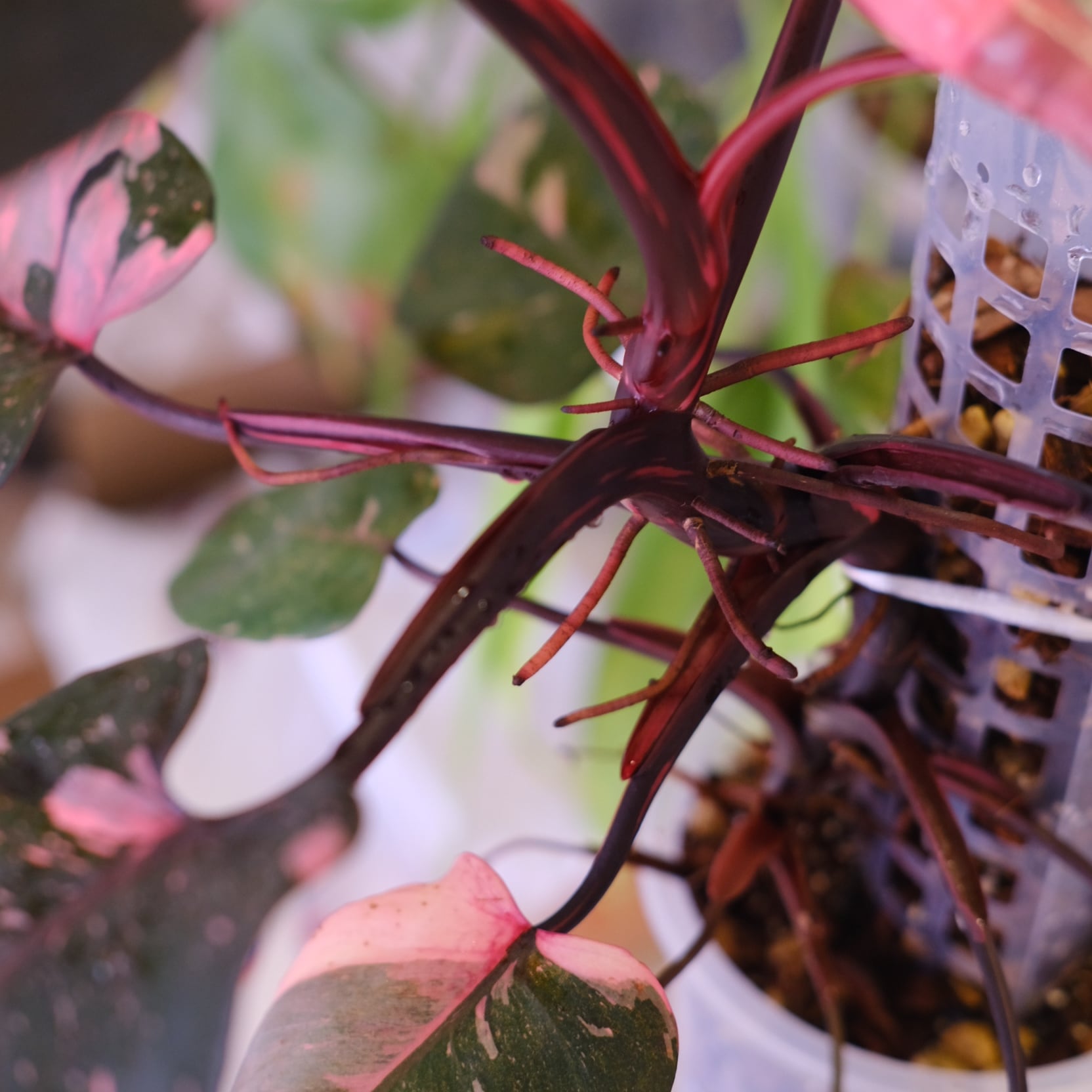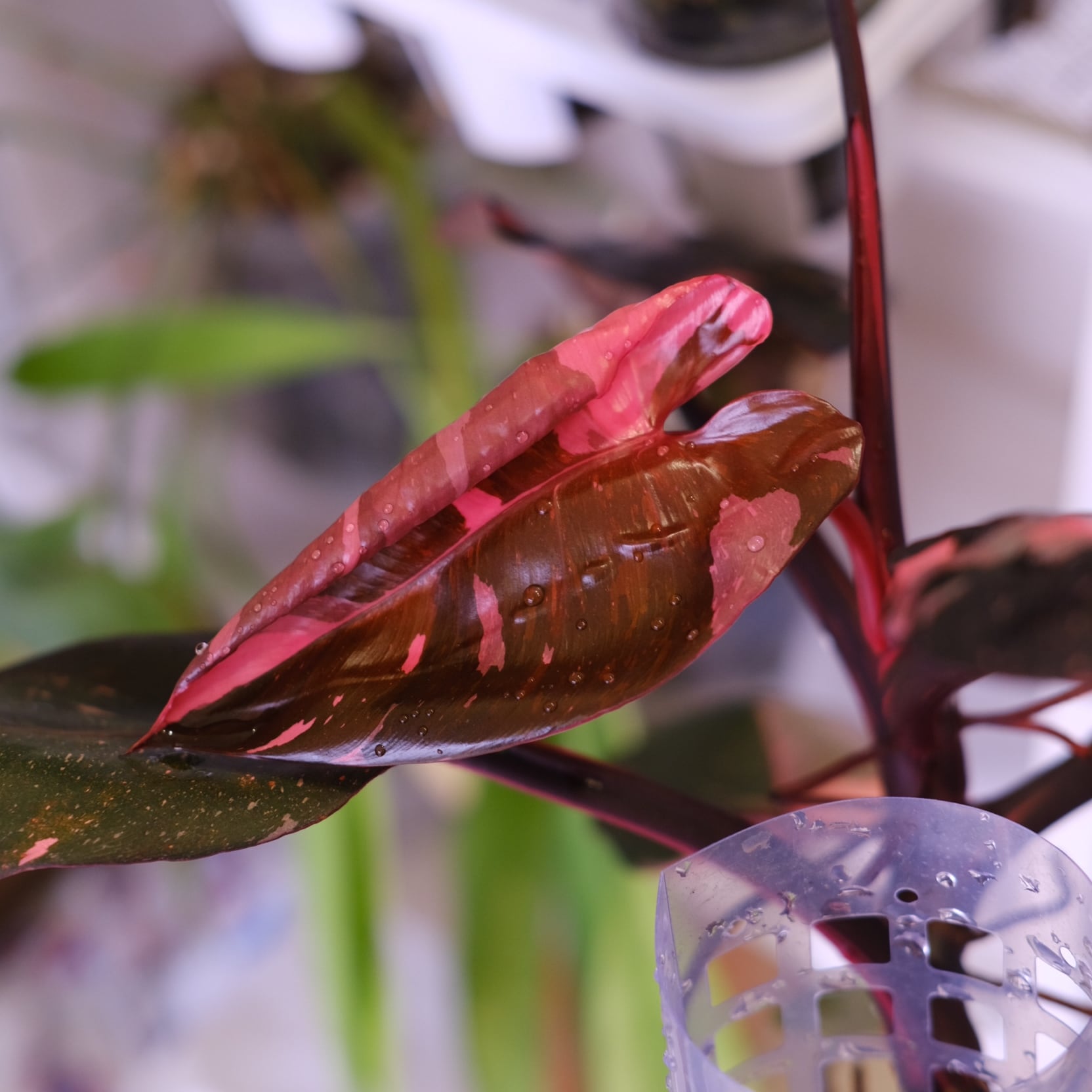 ピンク色の斑が美しいフィロデンドロン、Philodendron Pink Princess Marble Galaxy 。ピンクプリンセスの中でも特に希少で、葉の斑がマーブル状になり、ピンク、白、緑のコントラストが非常に美しい品種です。