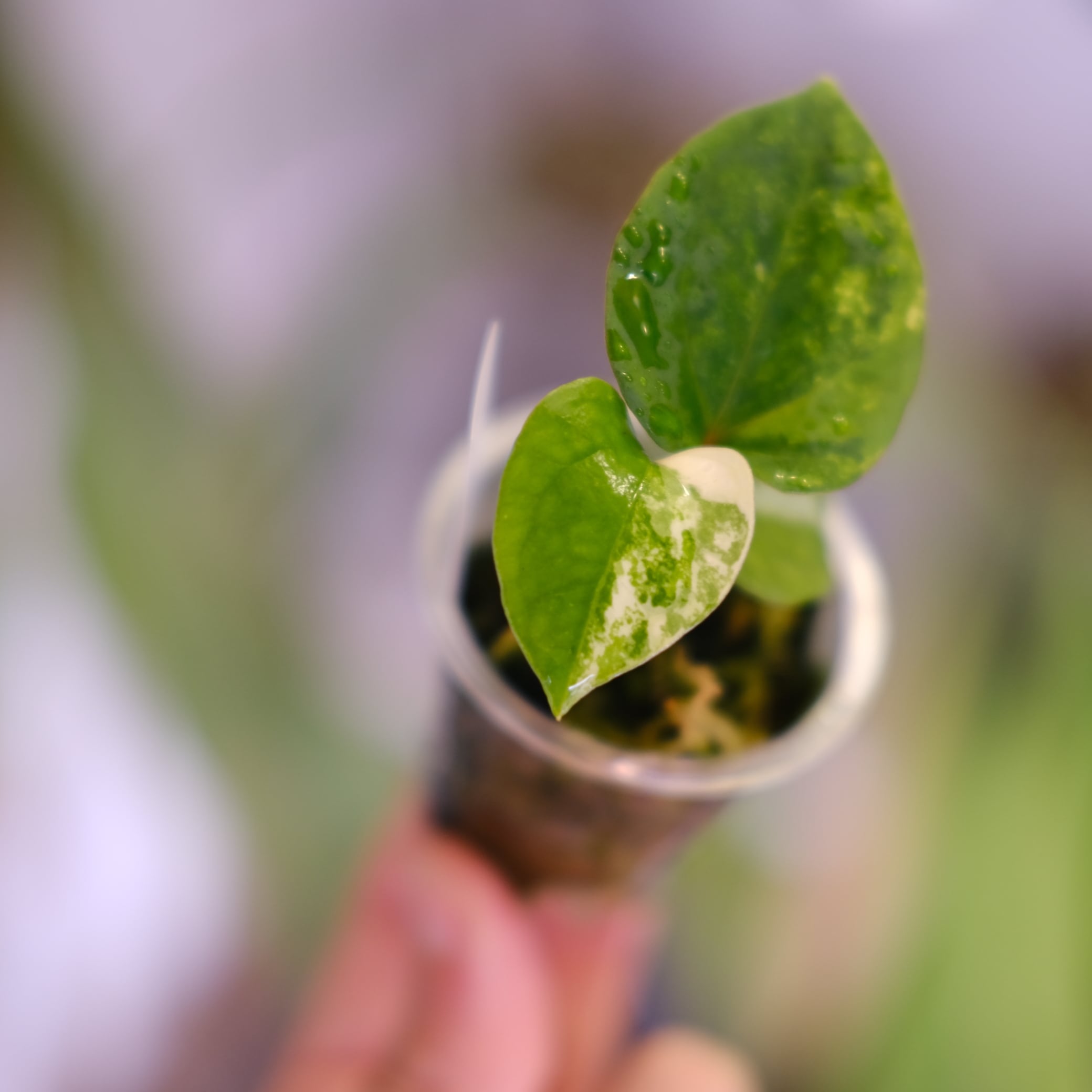 母系は Papililaminum variegated の葉形と質感に、Crystallinum marble の装飾的な葉脈表現を加えた系統です。父系は Dressleri による骨格とサイズ感、X-Ray の太く白い脈構造を掛け合わせています。質感・脈構造・葉形のいずれかが強く現れる可能性を持ちます。