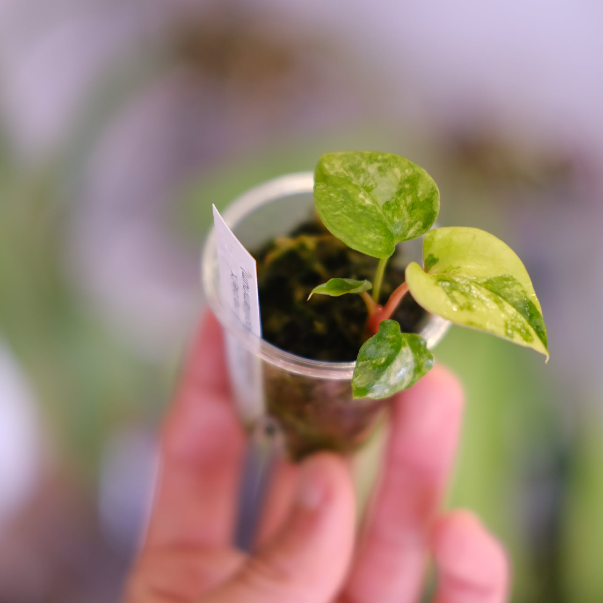 母系の Papililaminum variegated × Crystallinum marble は、ベルベット質な葉脈構造に美しい斑入りを持ちます。