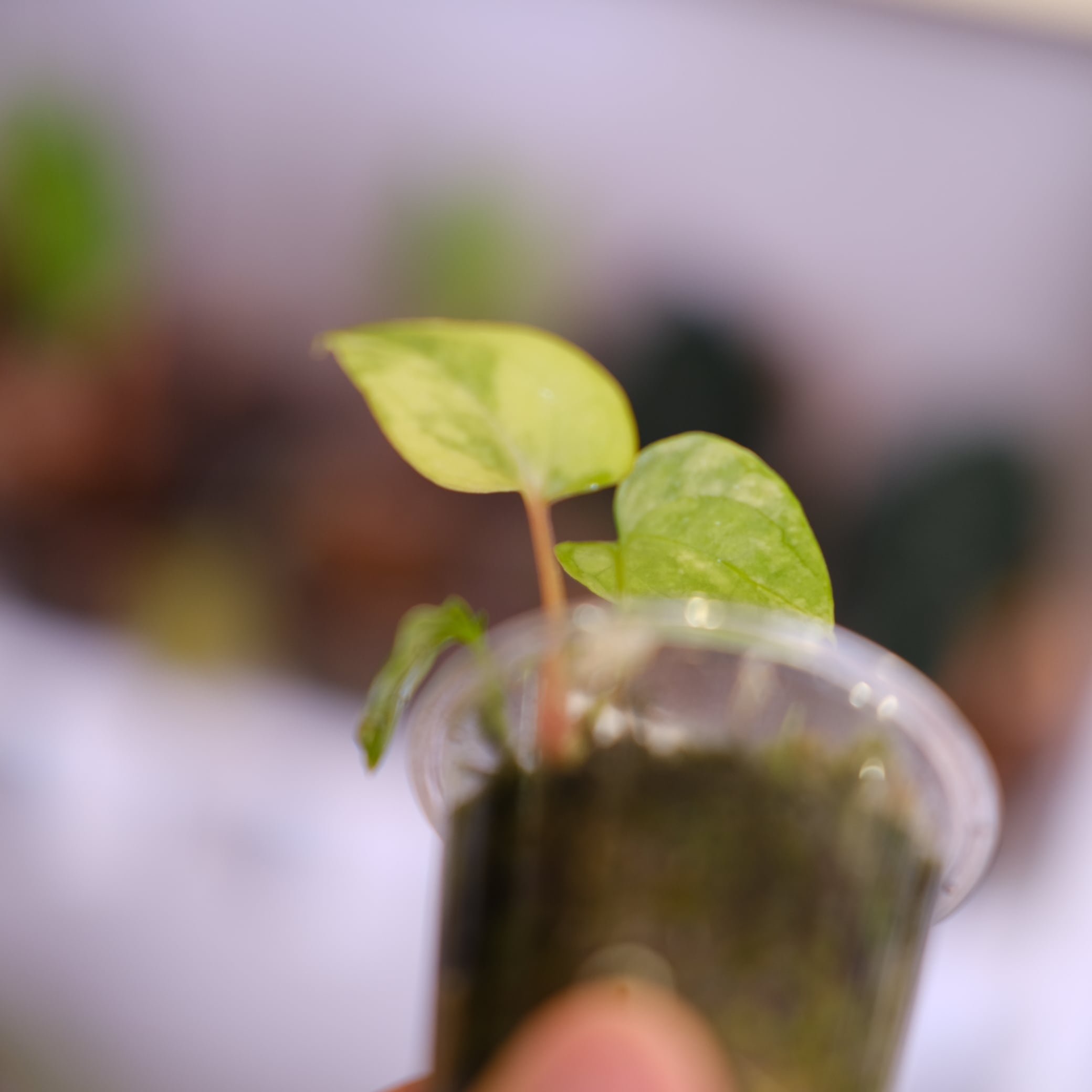 本交配では、葉形は中庸、質感はベルベット寄りに出やすく、成長とともに脈の立体感が増す可能性があります。