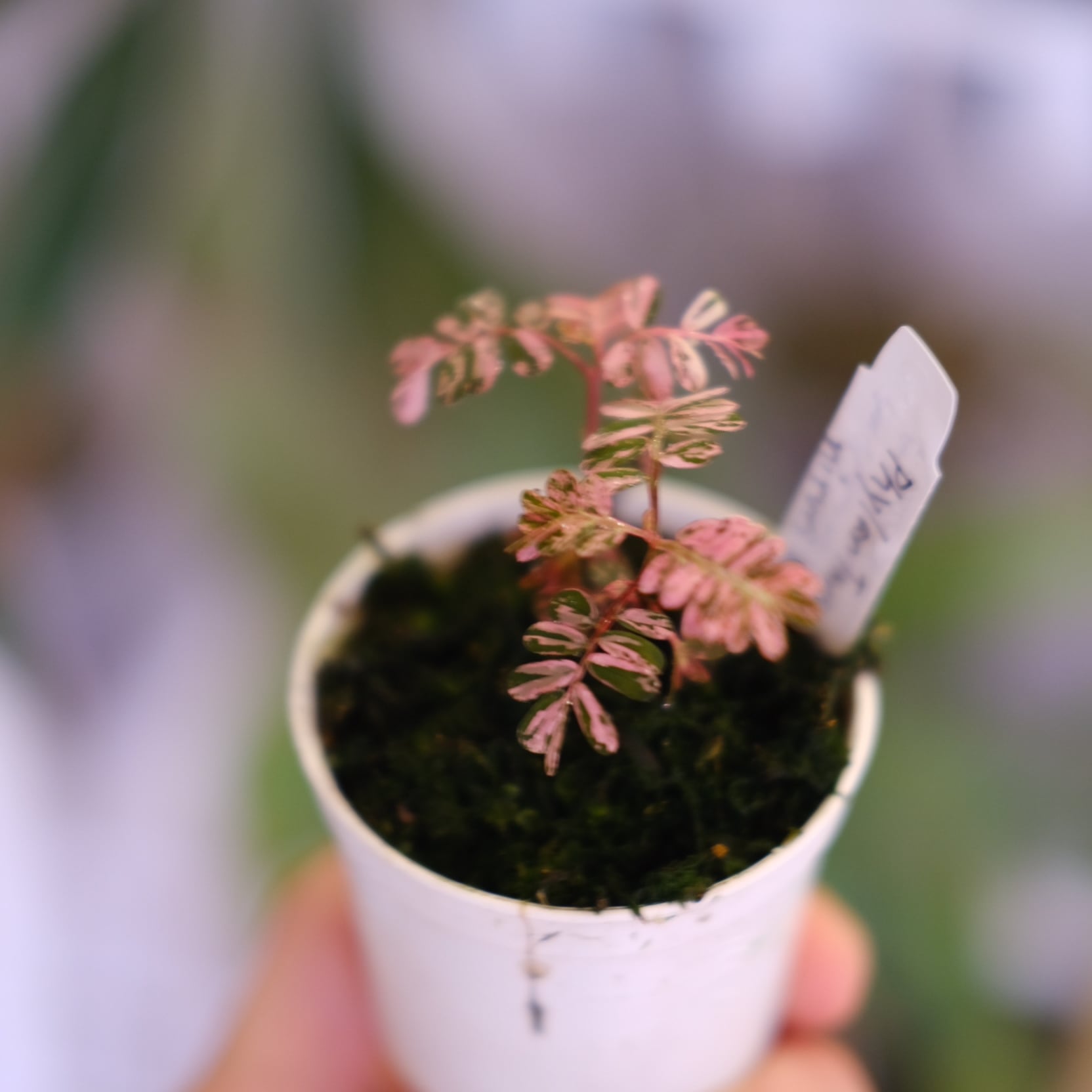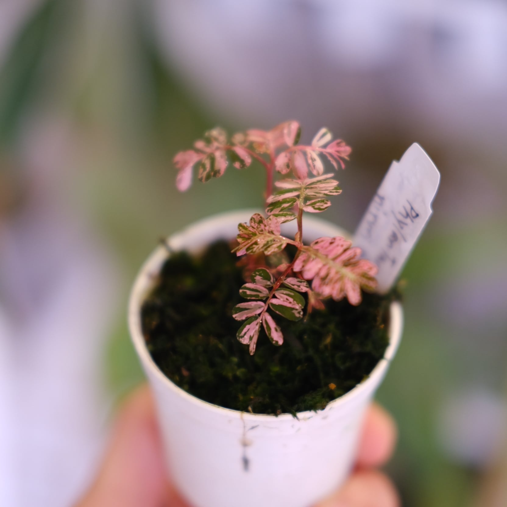 Phyllanthus urinaria 'Pink Variegated'(フィランサス・ウリナリア ピンク斑入り)は、繊細な見た目の美しさとは裏腹に、比較的育てやすい希少植物です。成長しても50cmほどに収まるサイズ感も特徴です。十分な光量・高湿度・20~25度程度の温度環境を保つとピンク色の発色が目立つ新芽が展開します。