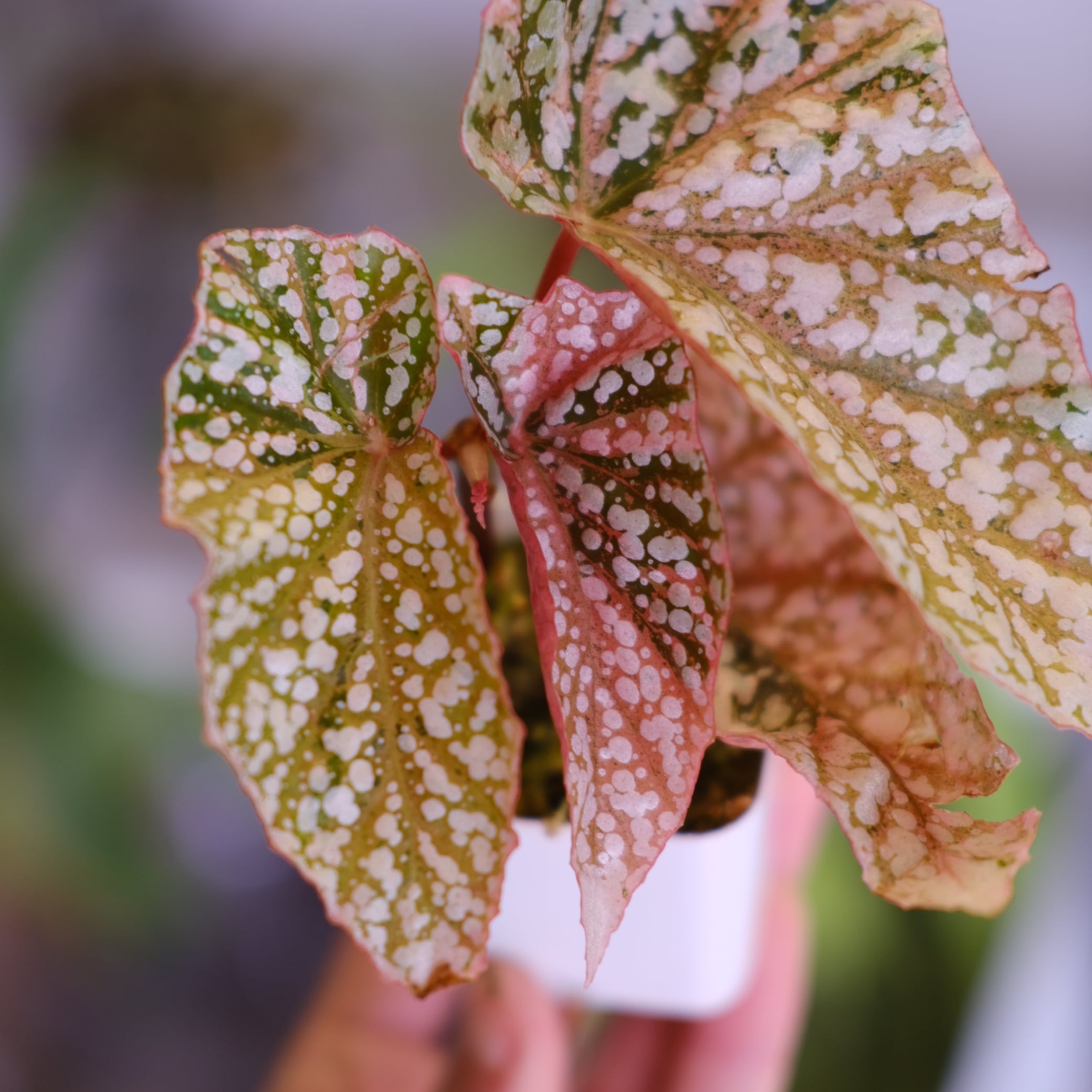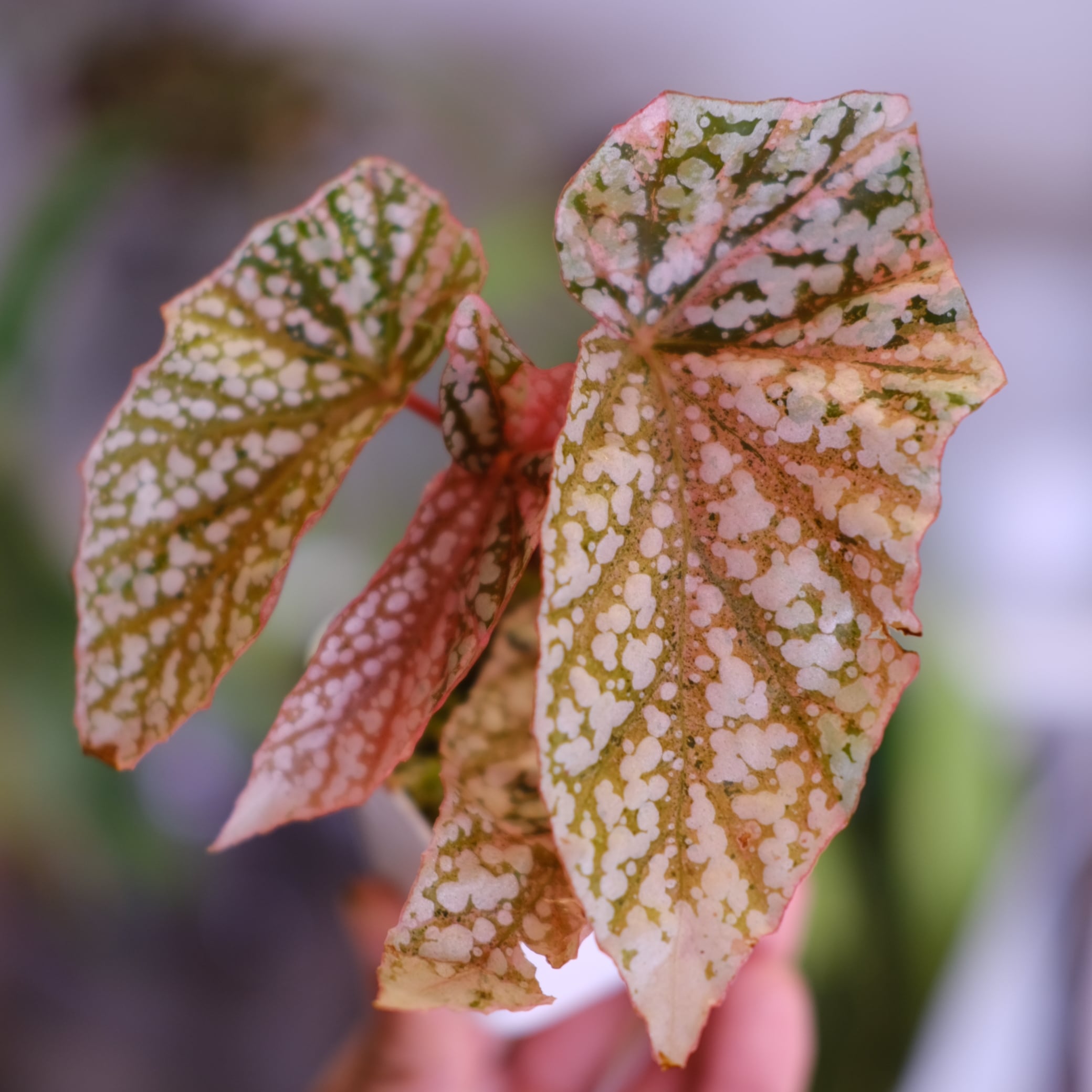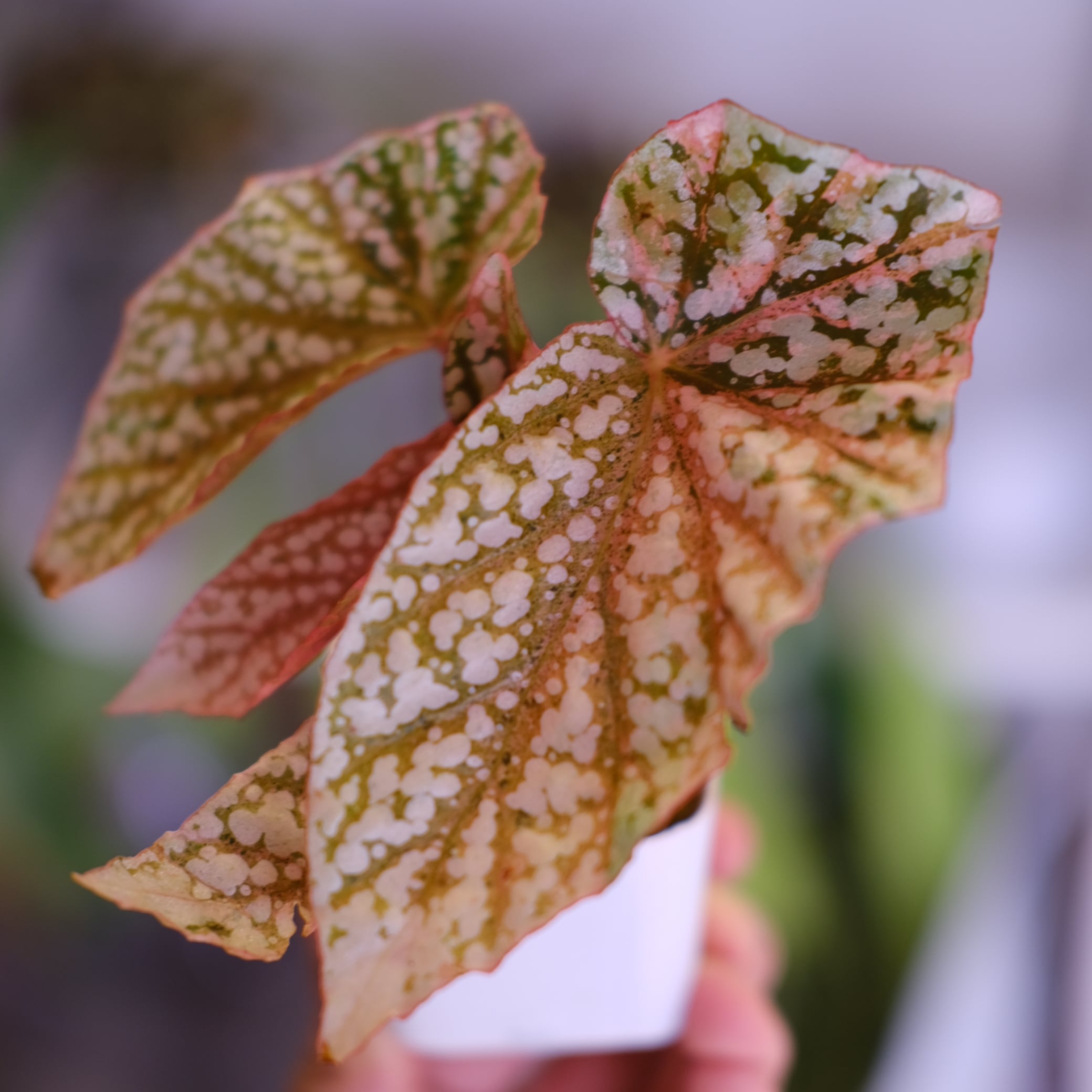 Begonia Snow Capped Variegata は、葉全面に細かな白斑が広がる観賞価値の高いベゴニアの園芸選抜系統です。新葉時にはピンクやブロンズの色味が強く、展開とともに緑と白の模様が明確になります。斑の配置は葉ごとに異なり、同じ株でも表情に変化が出ます。