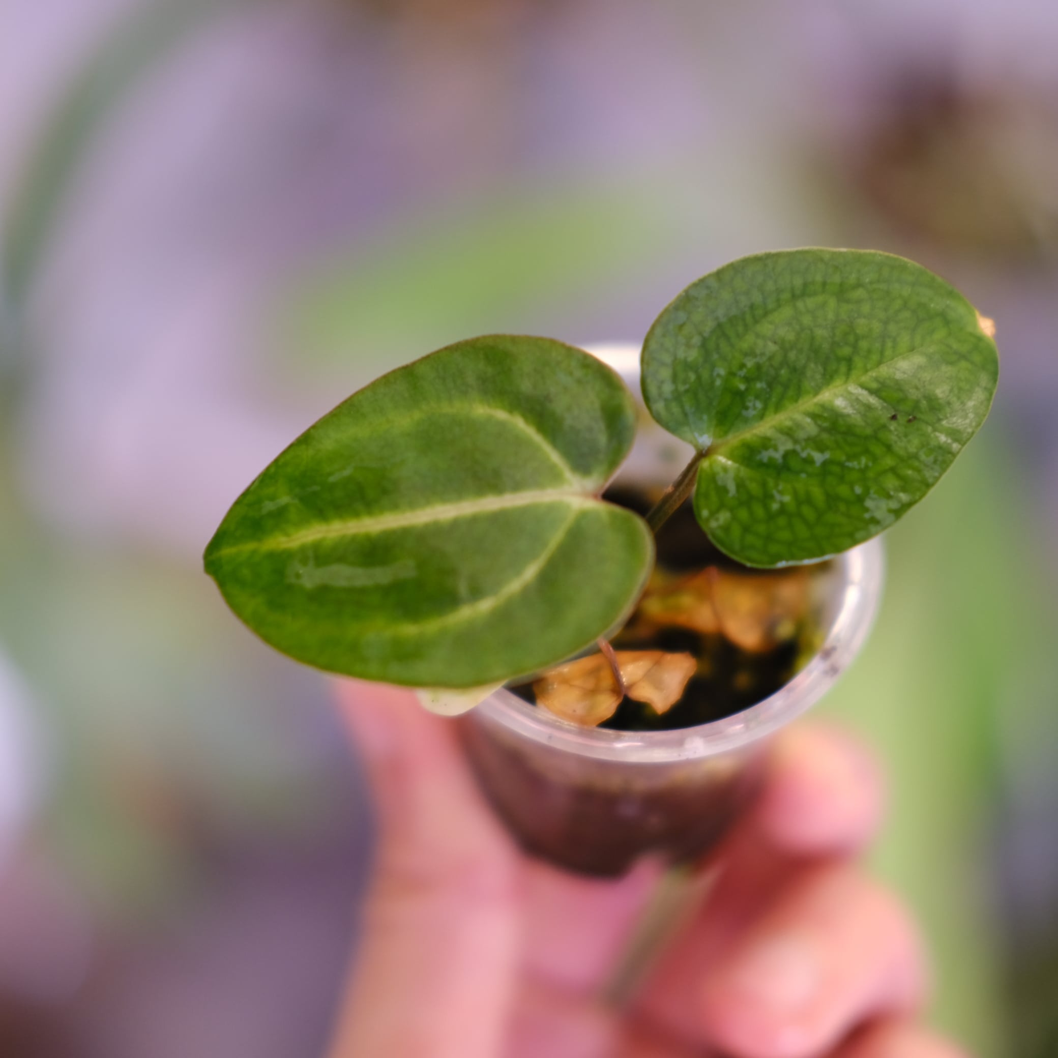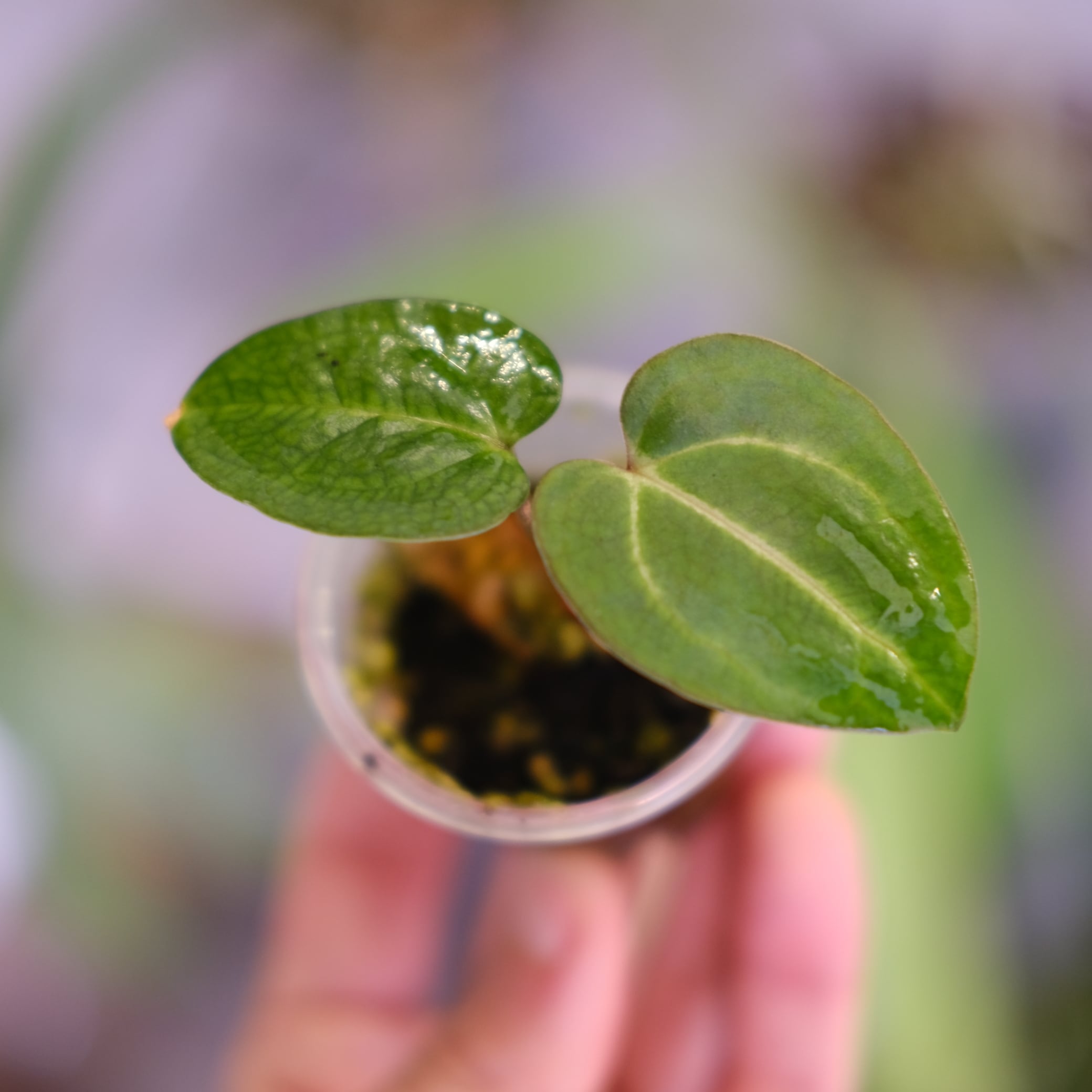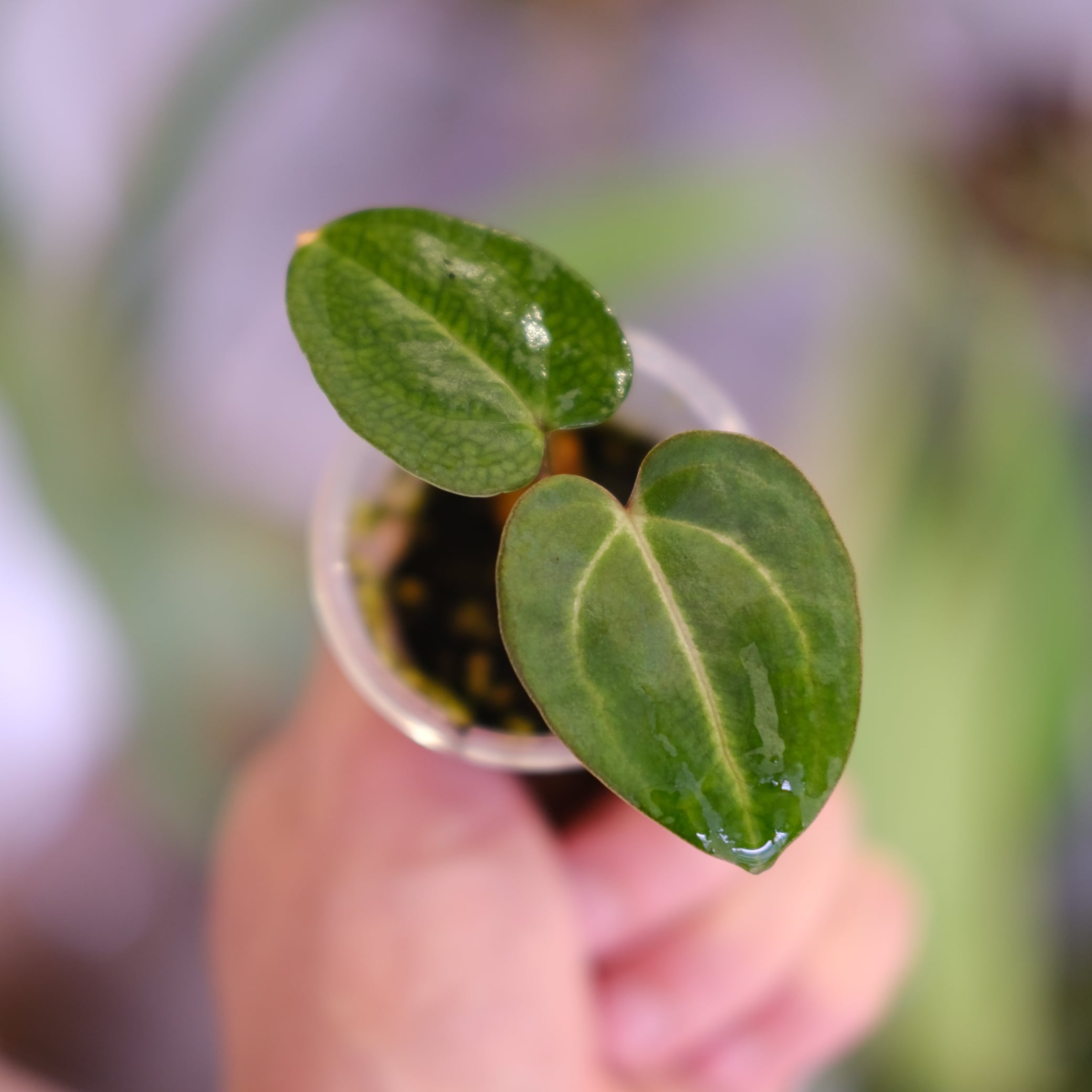 深みのある光沢を持ったハート型の葉にシャープな葉脈が入った姿が美しい、アンスリウム カーラブラッキアエの実生株です。いま世界中で最も注目を集めているアンスリウムの原種といっても過言ではない希少な種です。