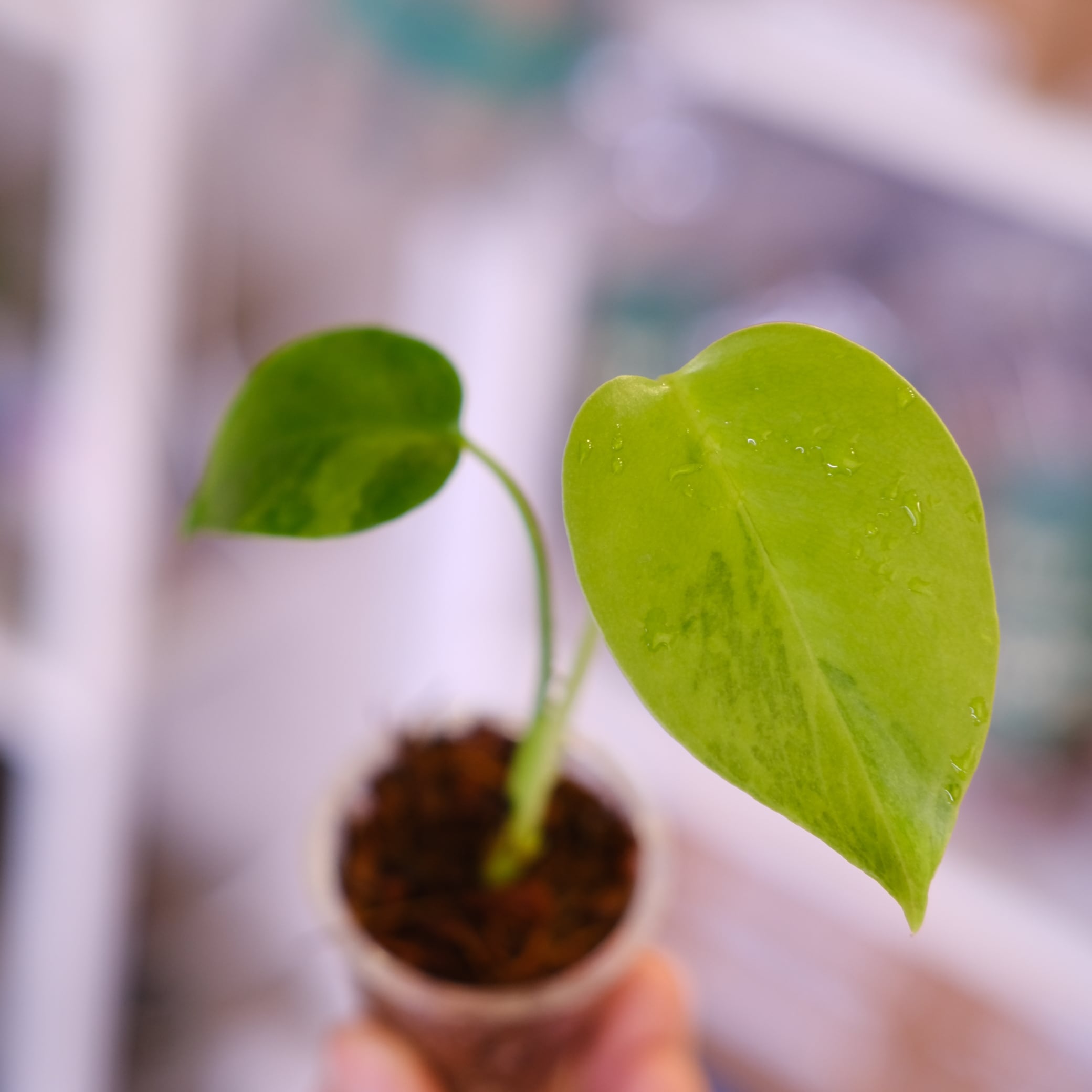green on green は、緑斑が不規則に入る系統の総称的な呼び名で、完全固定品種ではありません。そのため、葉ごとに模様の出方が異なり、斑が強く出る葉と控えめな葉が混在する場合があります。白斑系に比べて葉焼け耐性はやや高いものの、斑部分は光に弱いため、直射日光は避けた管理が適しています。