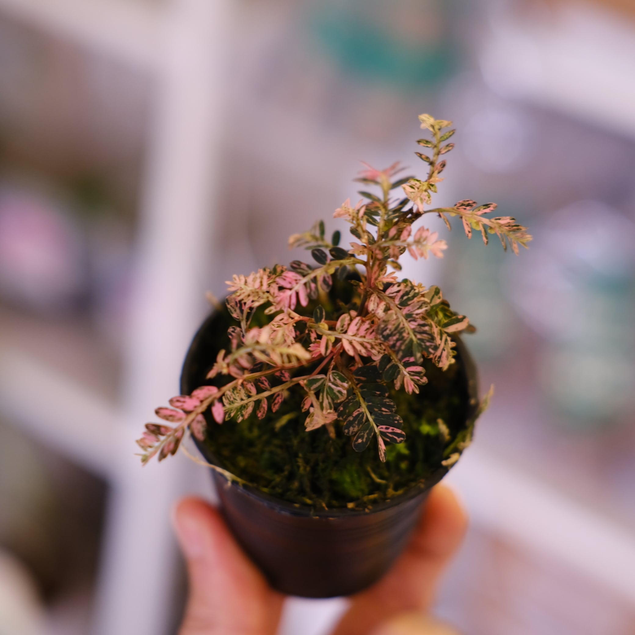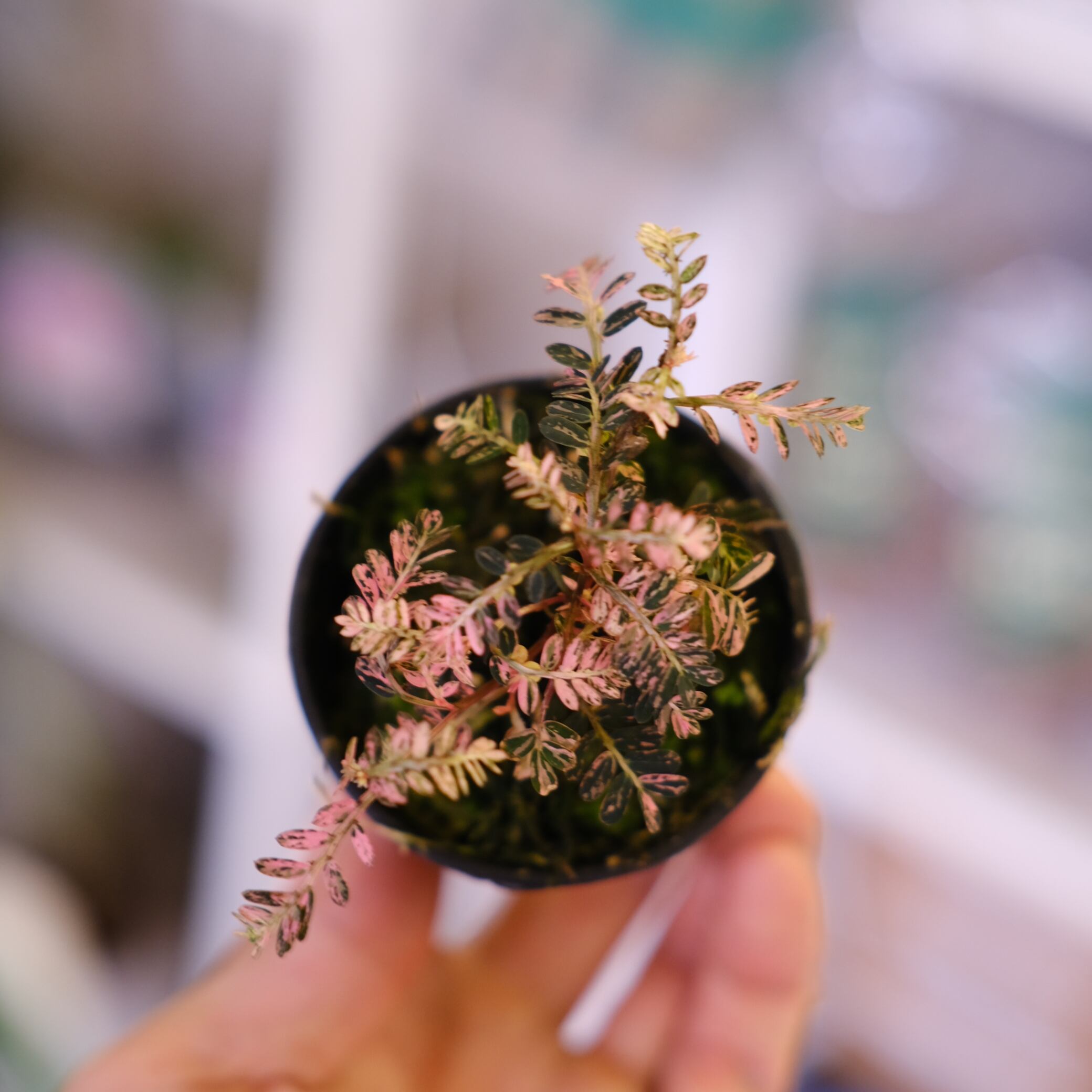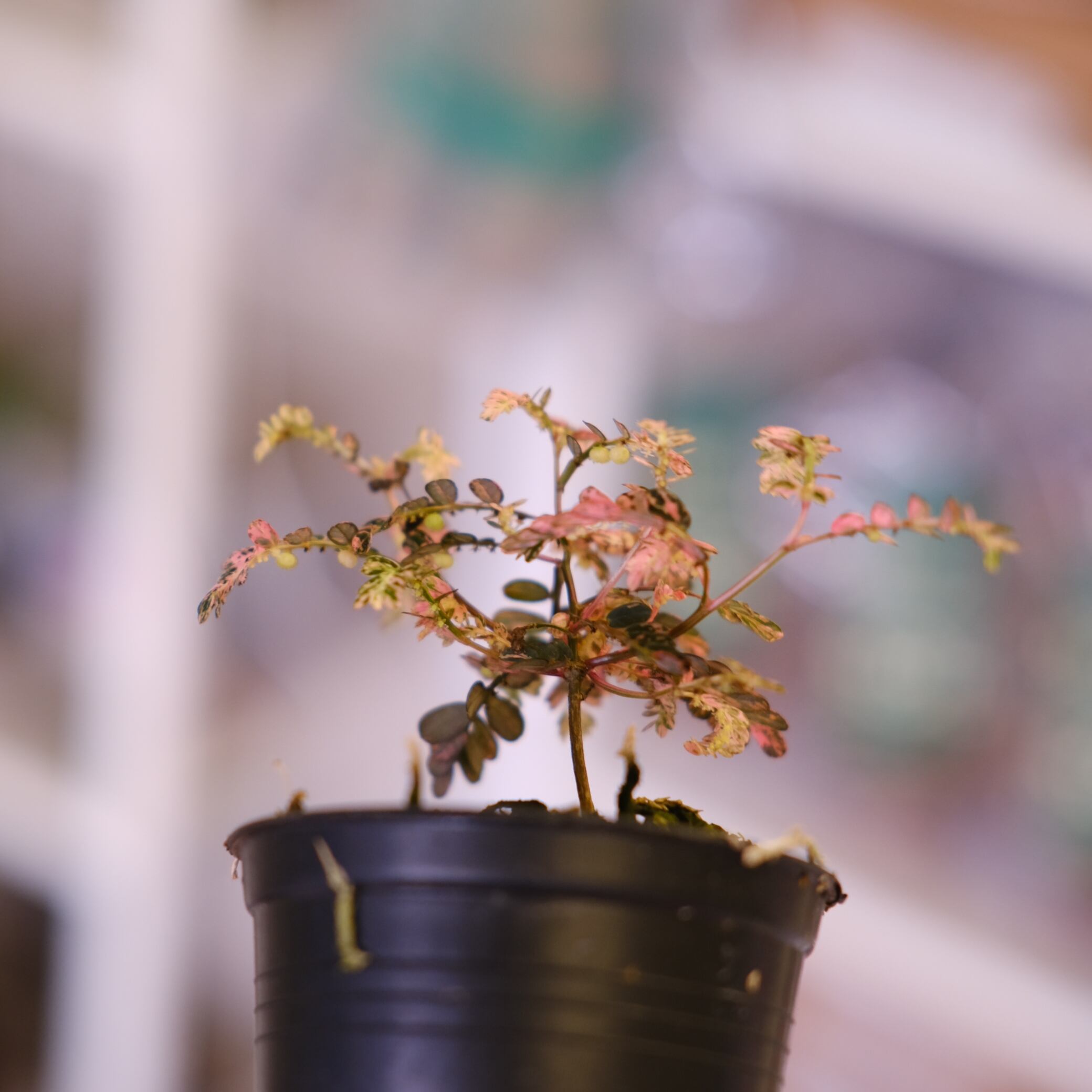 Phyllanthus urinaria 'Pink Variegated'(フィランサス・ウリナリア ピンク斑入り)は、繊細な見た目の美しさとは裏腹に、比較的育てやすい希少植物です。成長しても50cmほどに収まるサイズ感も特徴です。十分な光量・高湿度・20~25度程度の温度環境を保つとピンク色の発色が目立つ新芽が展開します。