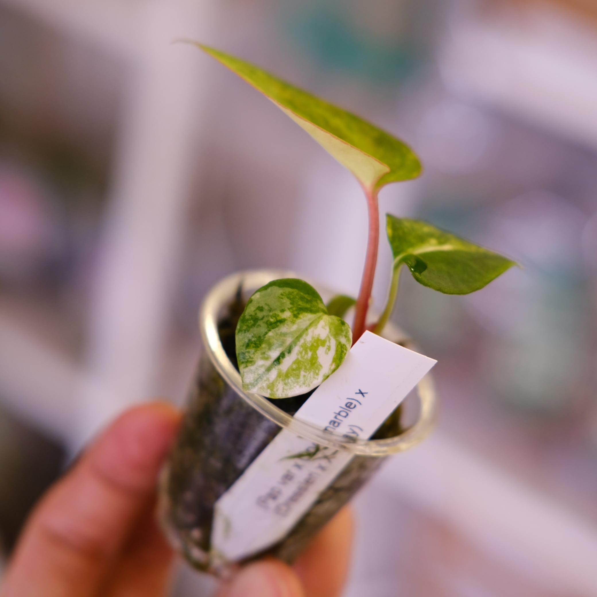 母系は Papililaminum variegated の葉形と質感に、Crystallinum marble の装飾的な葉脈表現を加えた系統です。父系は Dressleri による骨格とサイズ感、X-Ray の太く白い脈構造を掛け合わせています。質感・脈構造・葉形のいずれかが強く現れる可能性を持ちます。
