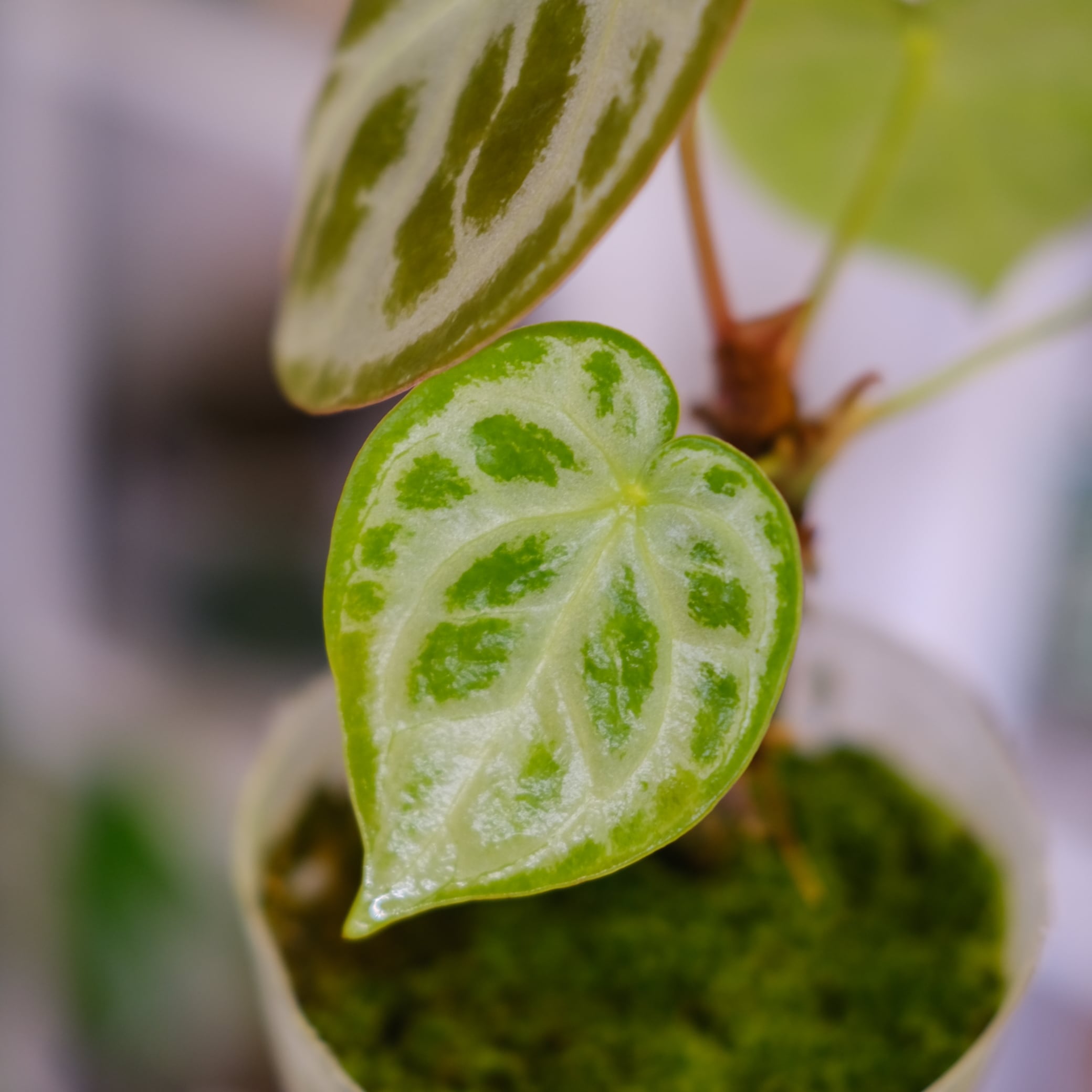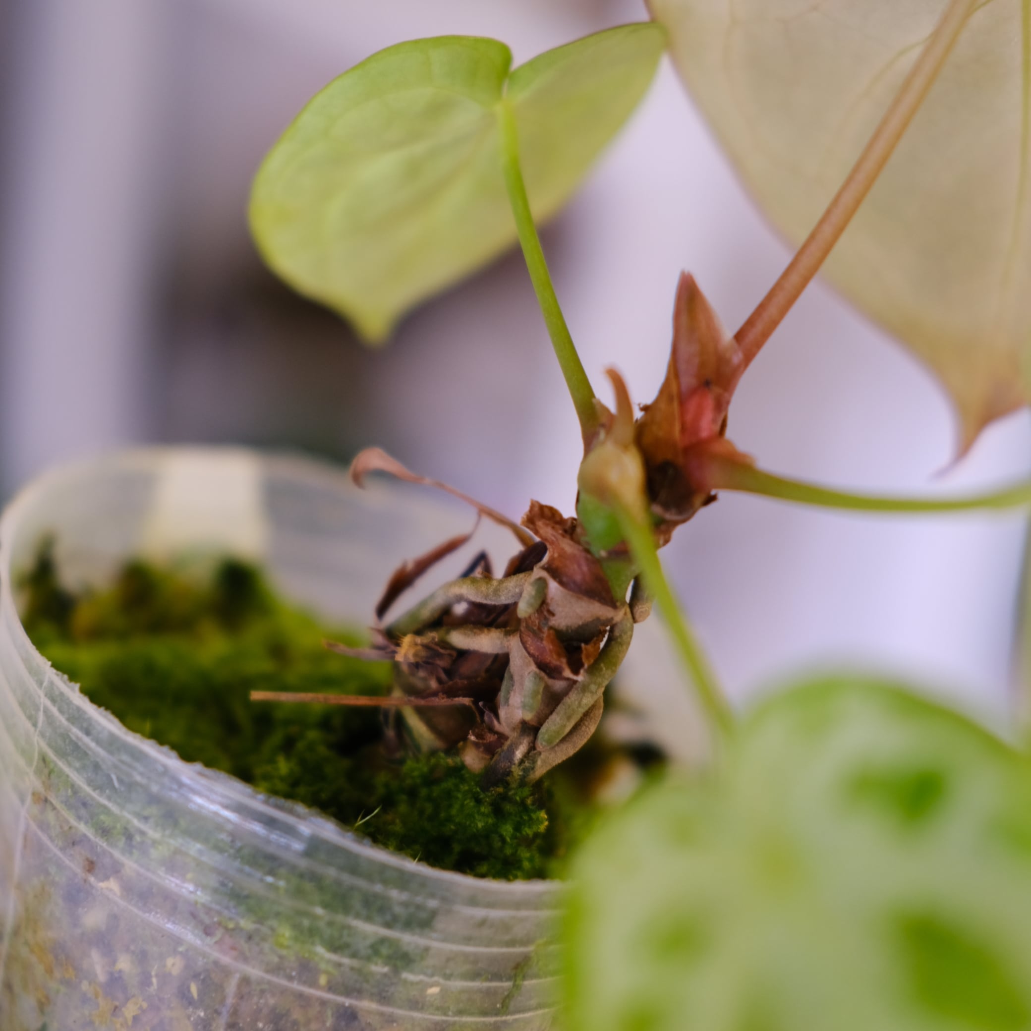 Anthurium Dorayaki × Anthurium Silver brush の希少なハイブリッドです。ドラヤキのぷっくりした可愛い葉の形を引き継ぎながら、シルバーブラッシュの銀色に輝くラメが入った葉脈が大変美しい品種です。