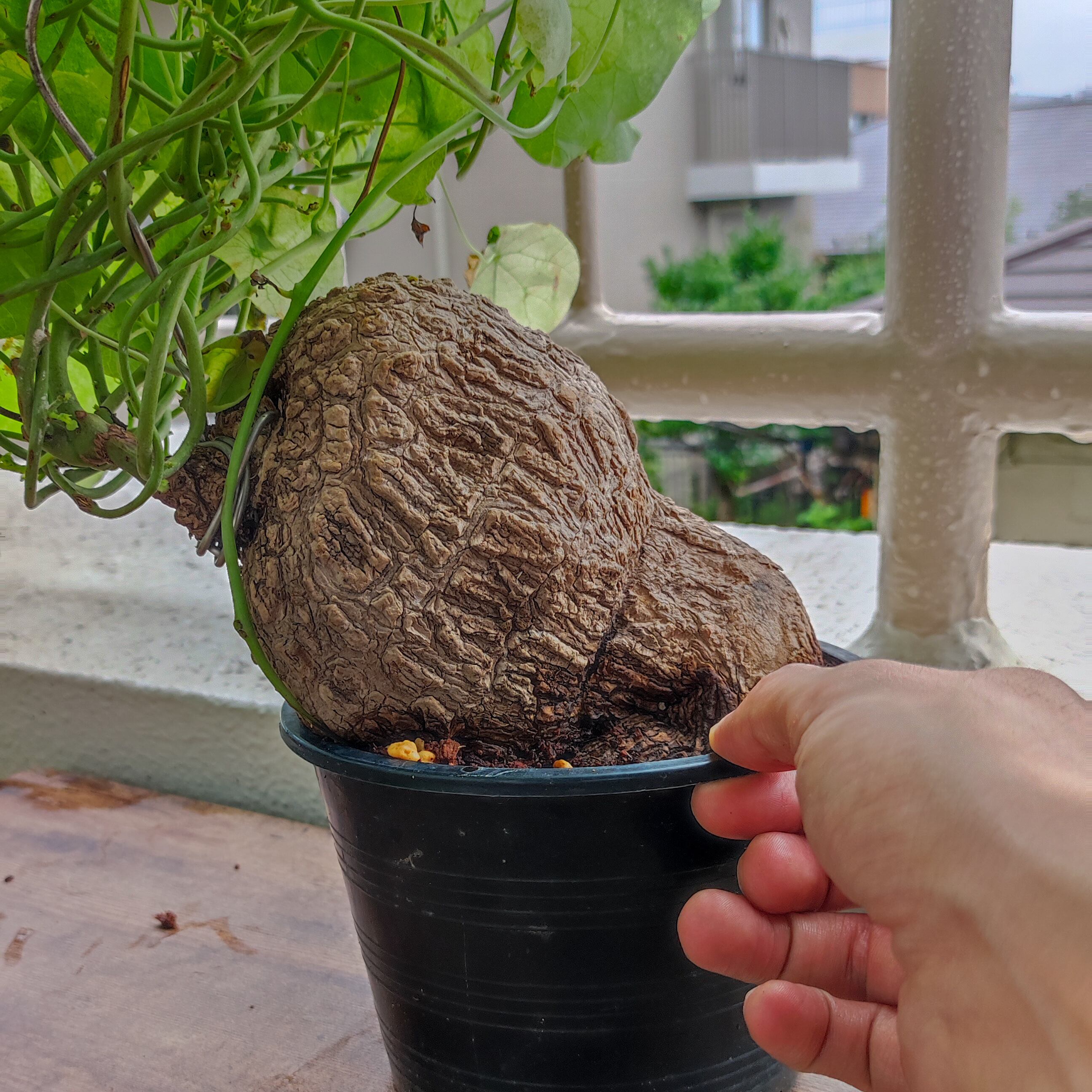 近頃人気を集めている"Stephania suberosa"の希少な【特大・斑入り株】になります。原産国のタイでもまだまだ珍しく高値で取引をされています。 繊細な斑入り株のため70%程度の遮光を行った環境での育成が望ましいです。弱った葉は茶色くなり再生ができませんが、次々と新しい葉が生えてきます。