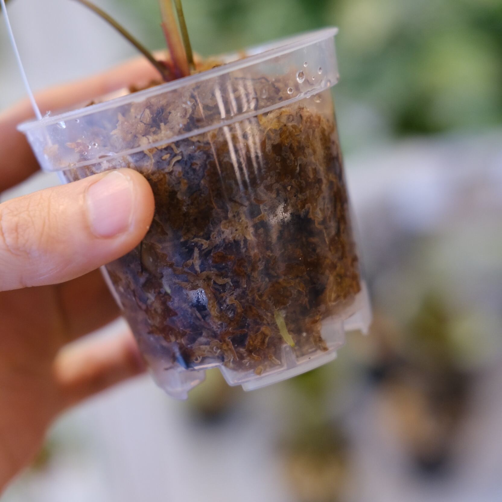 鉢は成長した植物の根を観察できるプラスチック鉢となり、アンスリウムの生育に適した【水苔】を用土としています。
