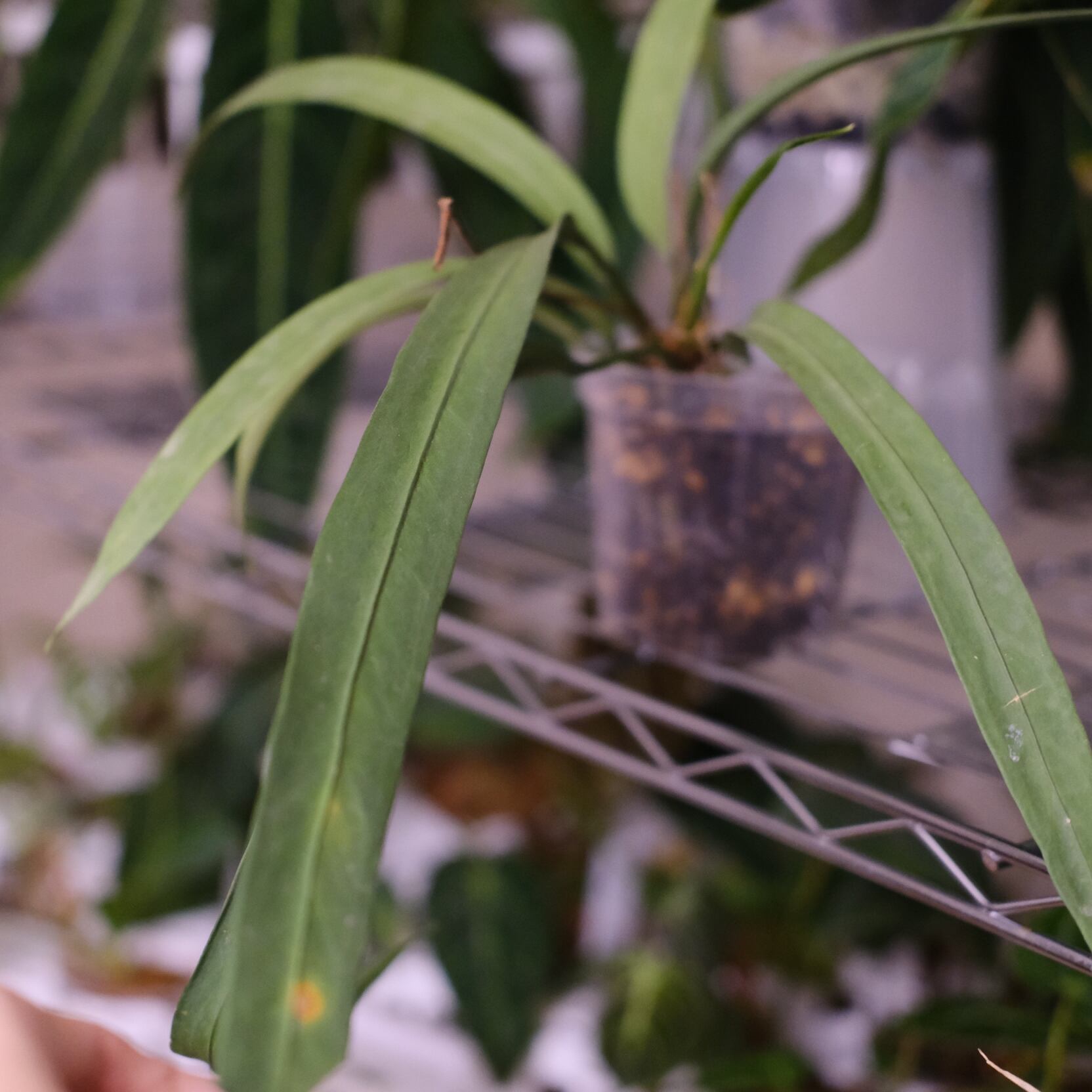 長くだらっと垂れる葉っぱが特徴のAnthrium vittarifoliumです。葉の枚数が多くとても引き締まった珍しい個体です。ハンギングや高さのある鉢などによく合いますよ。
