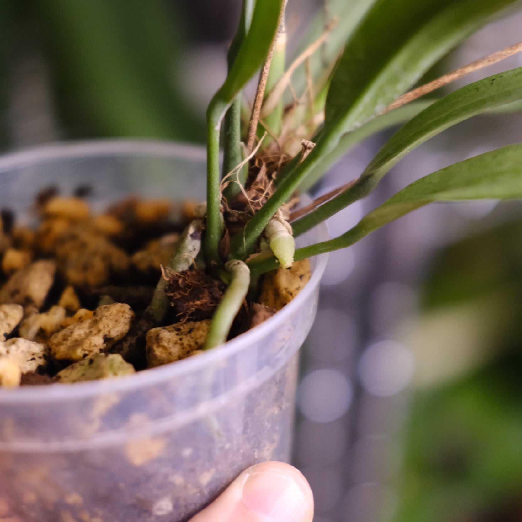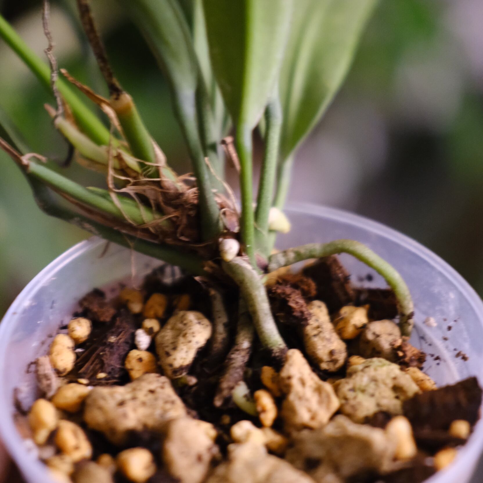 鉢は成長した植物の根を観察できるプラスチック鉢となり、アンスリウムの生育に適した【ココチップ+ひゅうが石+硬質鹿沼土+くん炭】を用土としています。