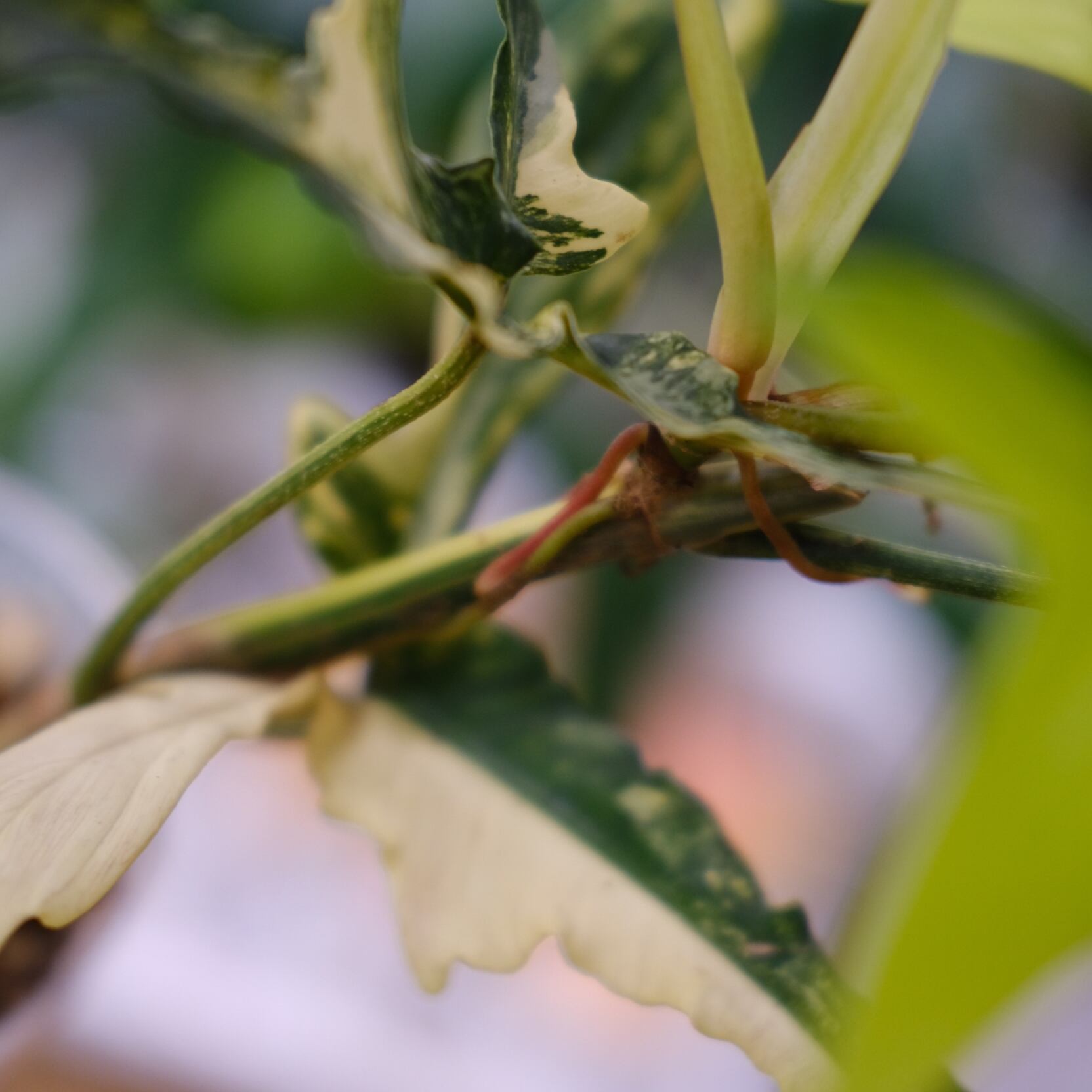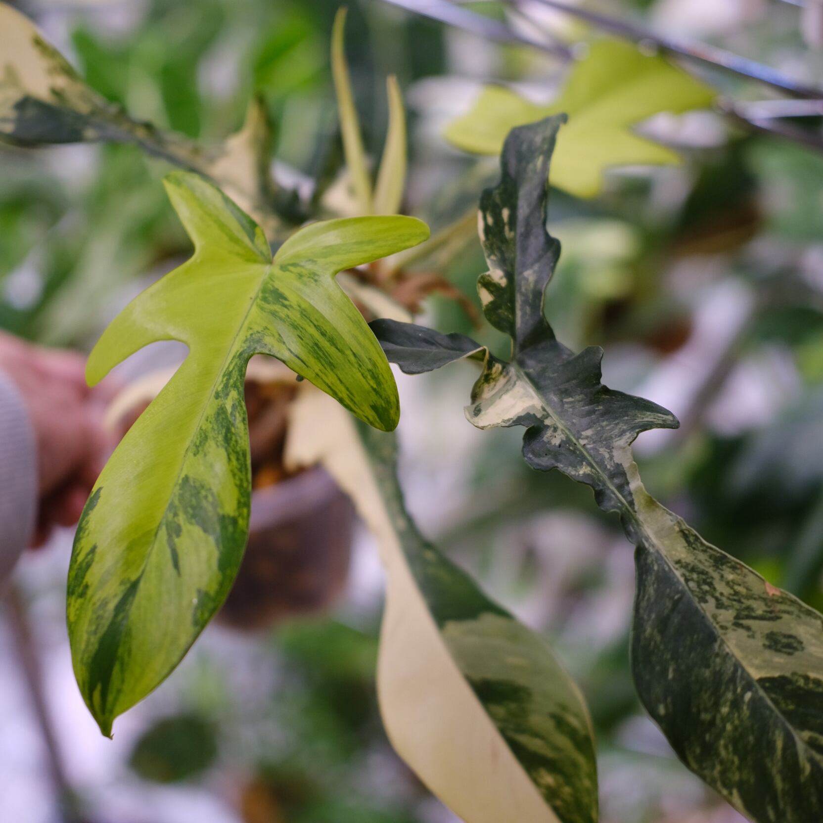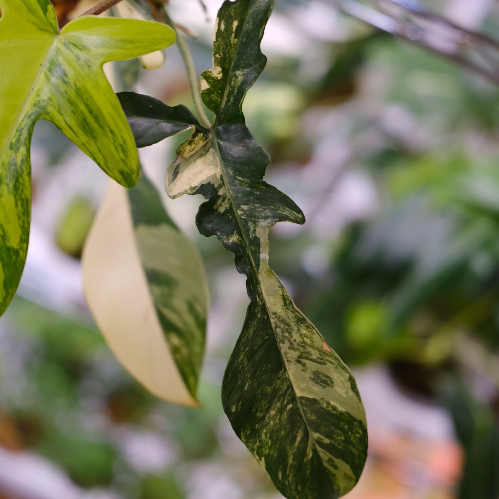 高級感漂うクリーム色の斑が美しい、サトイモ科に属するフィロデンドロン フロリダビューティー。まるで油絵のように斑が広がっていたり、綺麗に半分だけクリーム色になっていたりと様々な種類の模様を楽しめます。緑色の葉が展開した後でも温度と湿度を整えてあげるととても美しい斑が入った葉が展開してくることもあります。