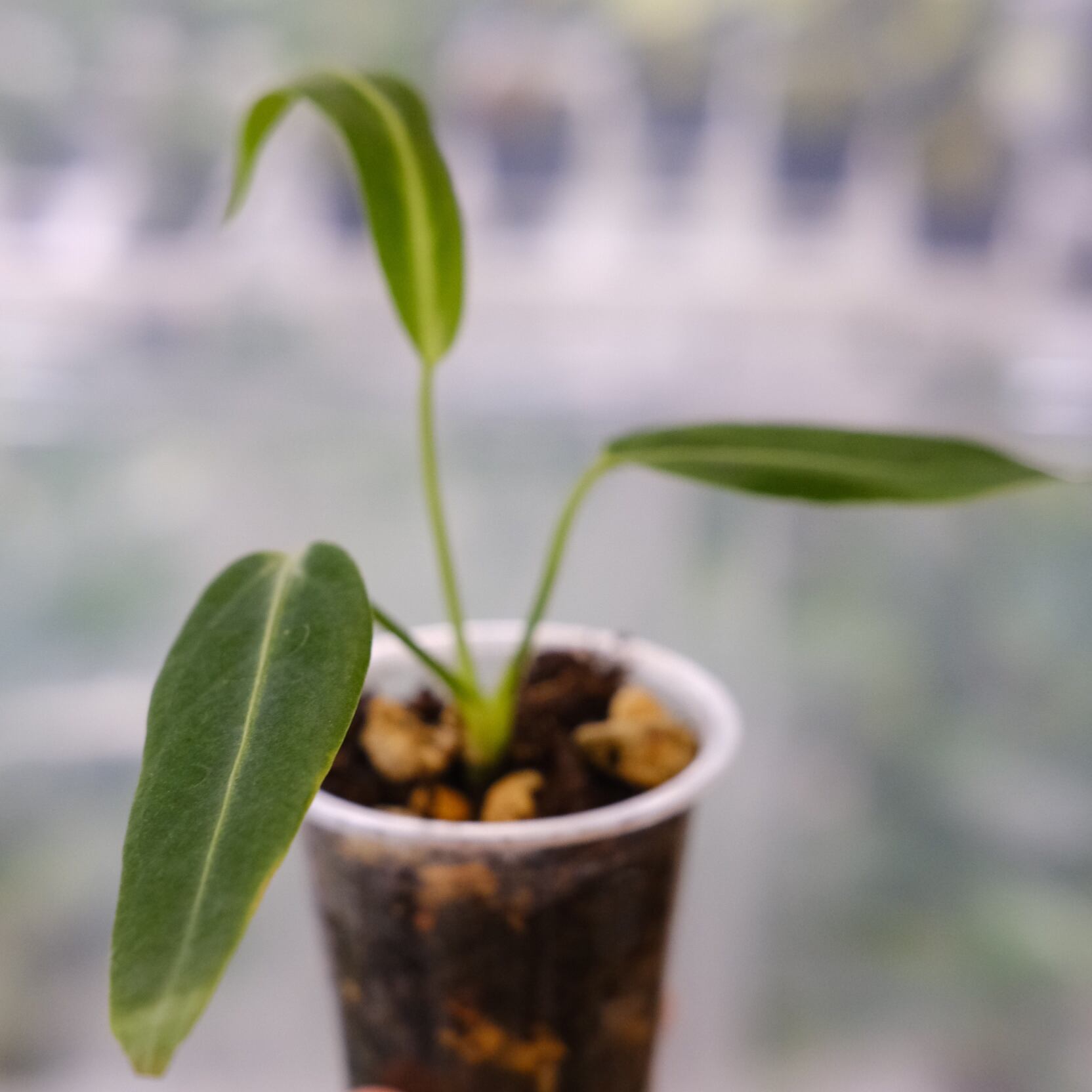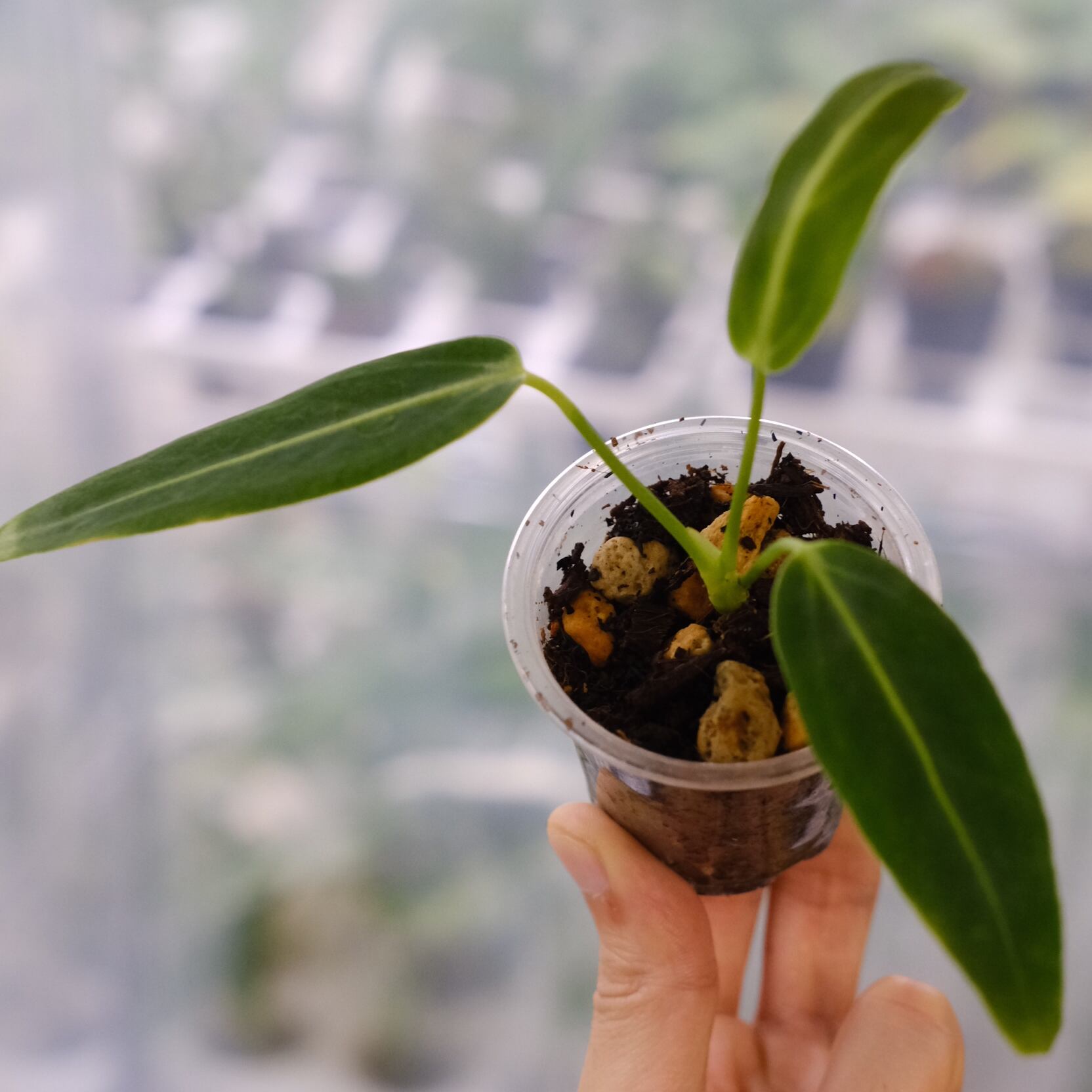 鉢は成長した植物の根を観察できるプラスチック鉢となり、アンスリウムの生育に適した【水苔】を用土としています。