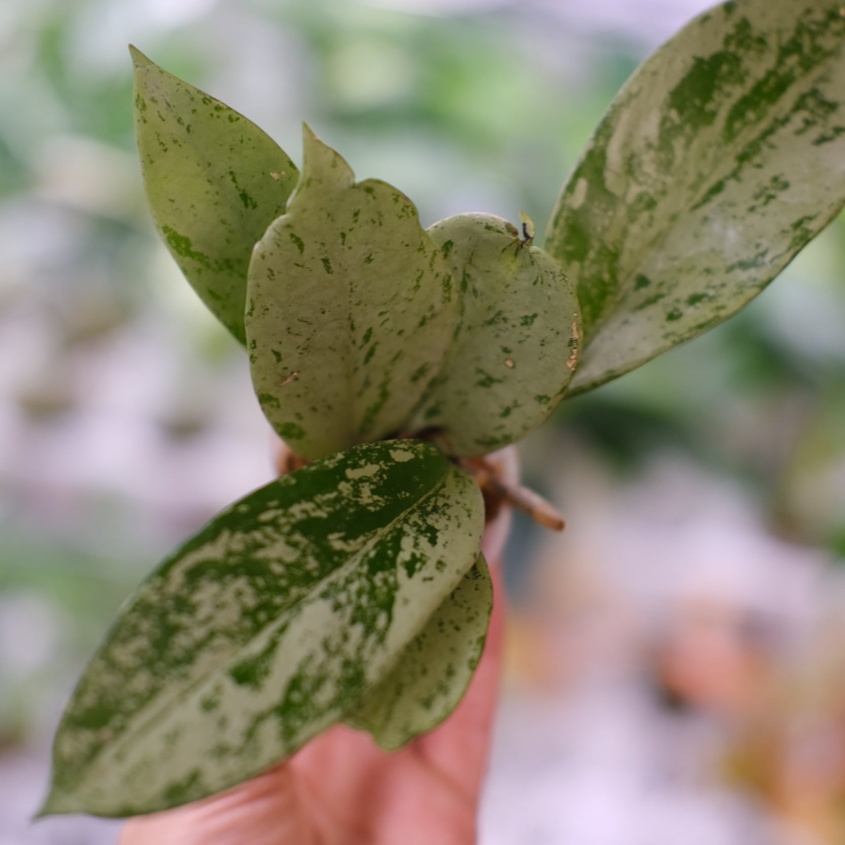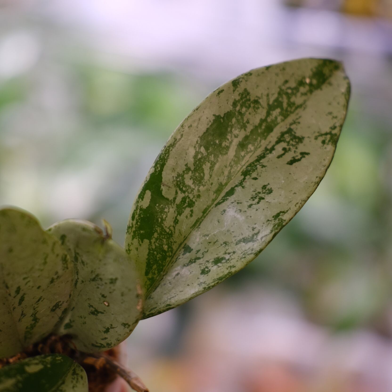 銀白色の葉と緑色の葉脈が特徴的な、美しいバリエガータ品種です。銀色の斑点(「ピンクシルバー」の名の由来)が特徴的で、光を反射するような輝きがあります。新葉は特にピンクがかった色合いを帯びることがあり、美しい彩りを見せます。