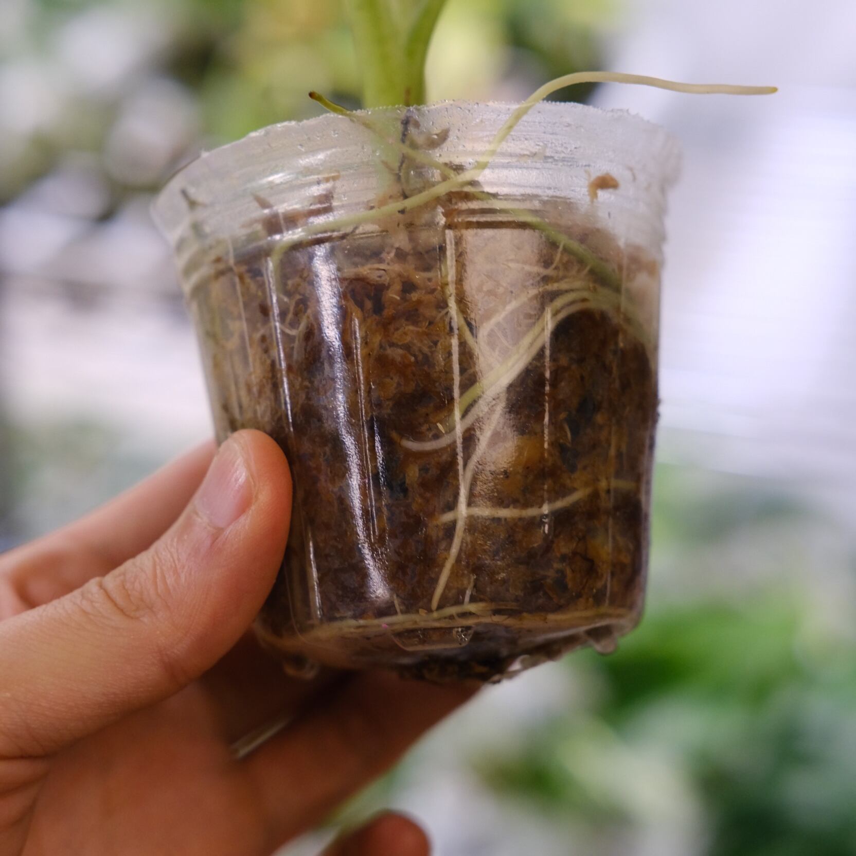 鉢は成長した植物の根を観察できるプラスチック鉢となり、生育に適した【水苔】を用土としています。