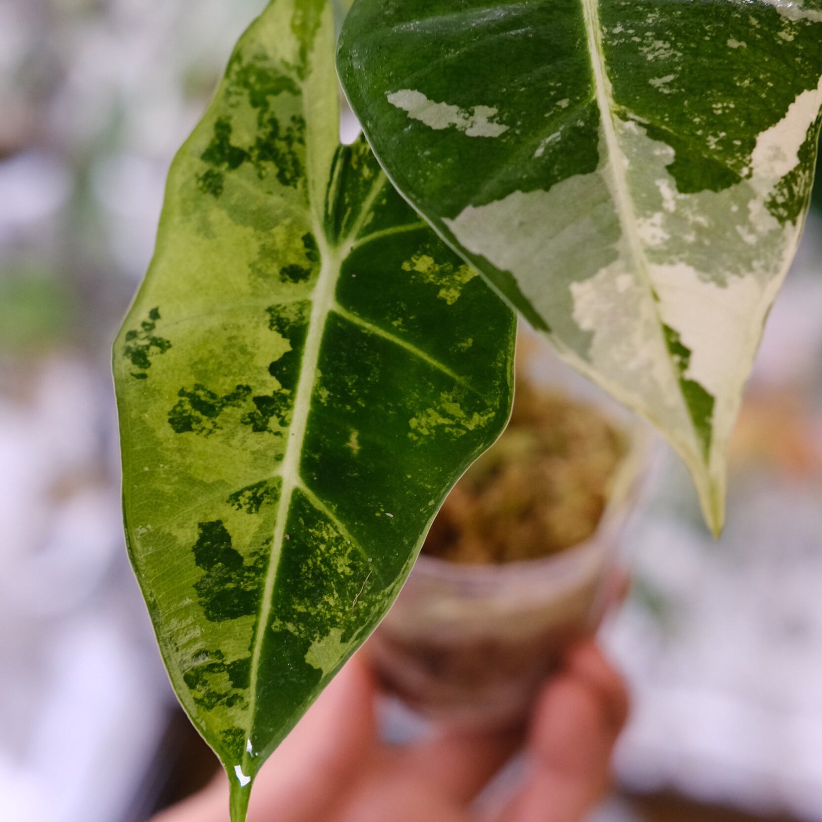 斑入り品種特有の性質として、明るい間接光を好みます。ただし、直射日光に当たると葉が焼けることがあるため注意が必要です。湿度は70%くらいが理想です。水はけの良い用土のため、5日に1回くらいの頻度でたっぷり水やりをしてあげてください。水やりは控えめにし、土が乾いてから与えるようにします。湿気が多いと根腐れを起こしやすいので、排水性の良い土を使うのがおすすめです。