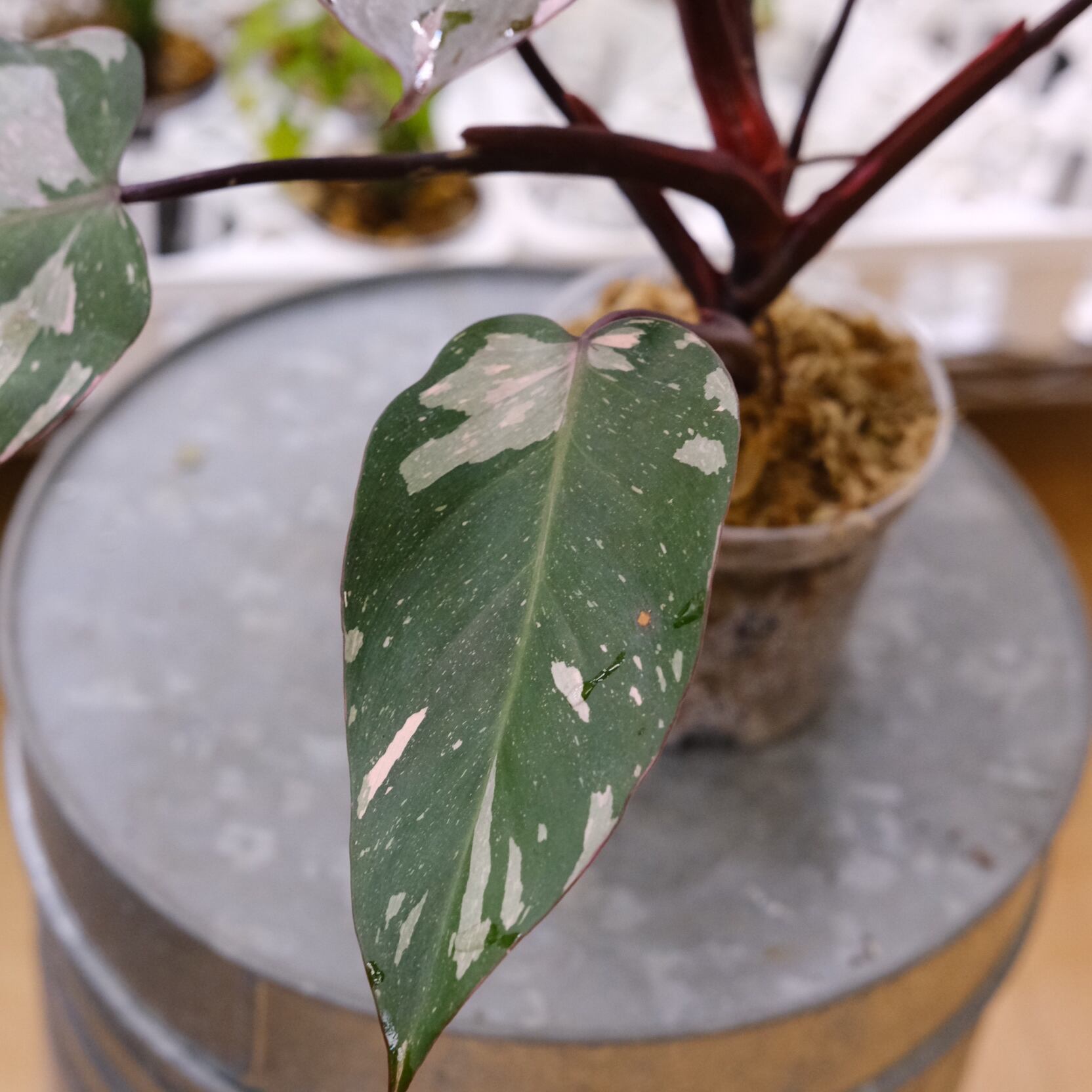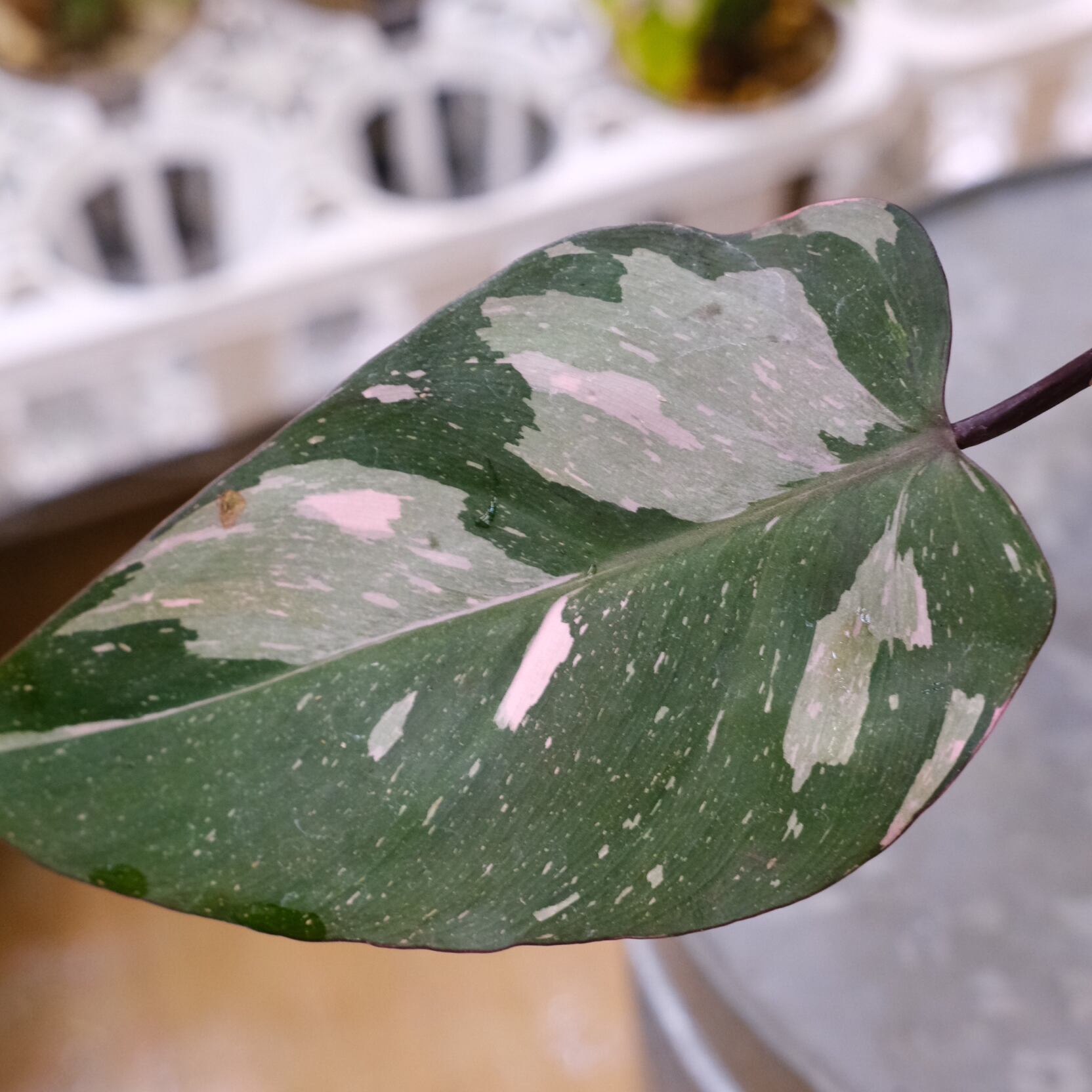 ピンク色の斑が美しいフィロデンドロン、Philodendron Pink Princess Marble Galaxy 。ピンクプリンセスの中でもマーブルギャラクシーは特に希少で、葉の斑がマーブル状になり、ピンク、白、緑のコントラストが非常に美しい品種です。