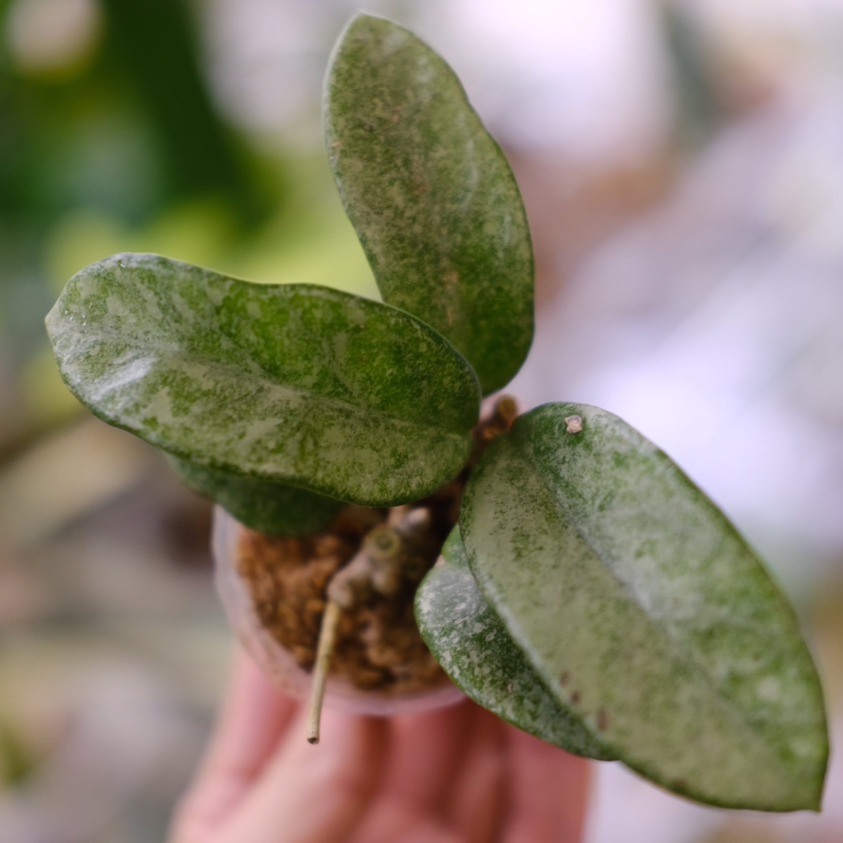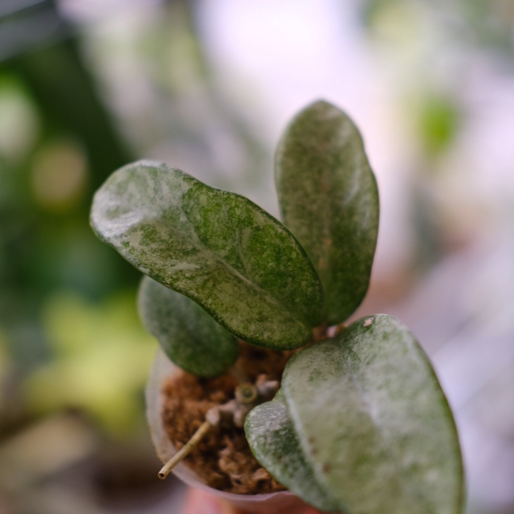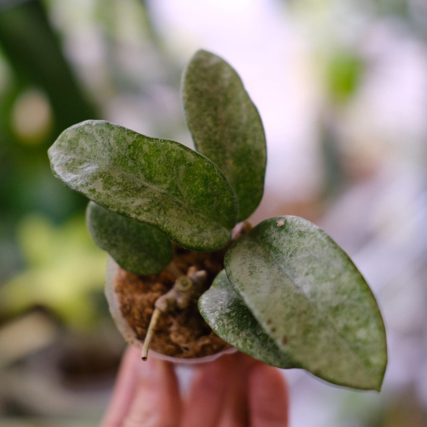 銀白色の葉と緑色の葉脈が特徴的な、美しいバリエガータ品種です。葉全体がシルバーや白に近い色合いを持ち、葉脈部分には淡い緑色の模様が見られます。新しい葉は特に鮮やかな白に近い色合いで、成長とともにより深みのあるトーンへと変化していきます。丈夫で耐陰性があるため、初心者から上級者まで楽しめる人気の高いホヤです。
