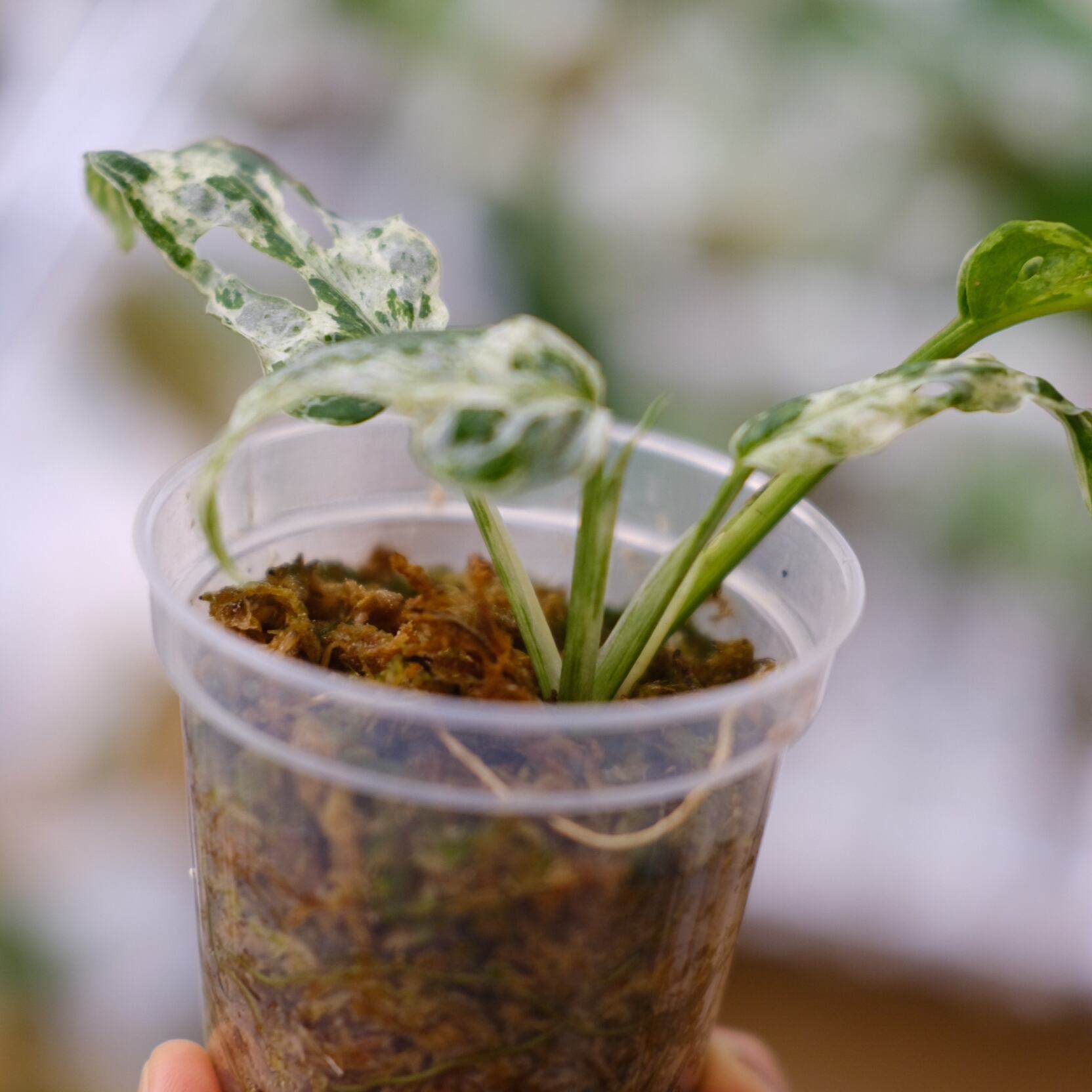 葉全体にミント斑がまだらに広がっている希少なモンステラ アダンソニーです。本株にはモスポールを使用しており、発根状況も良好です。