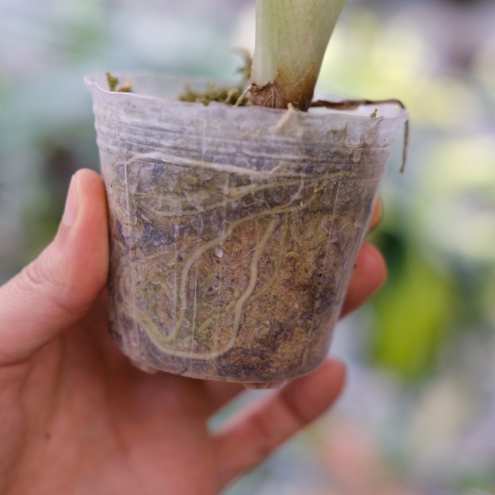 鉢は成長した植物の根を観察できるプラスチック鉢となり、生育に適した【水苔】を用土としています。