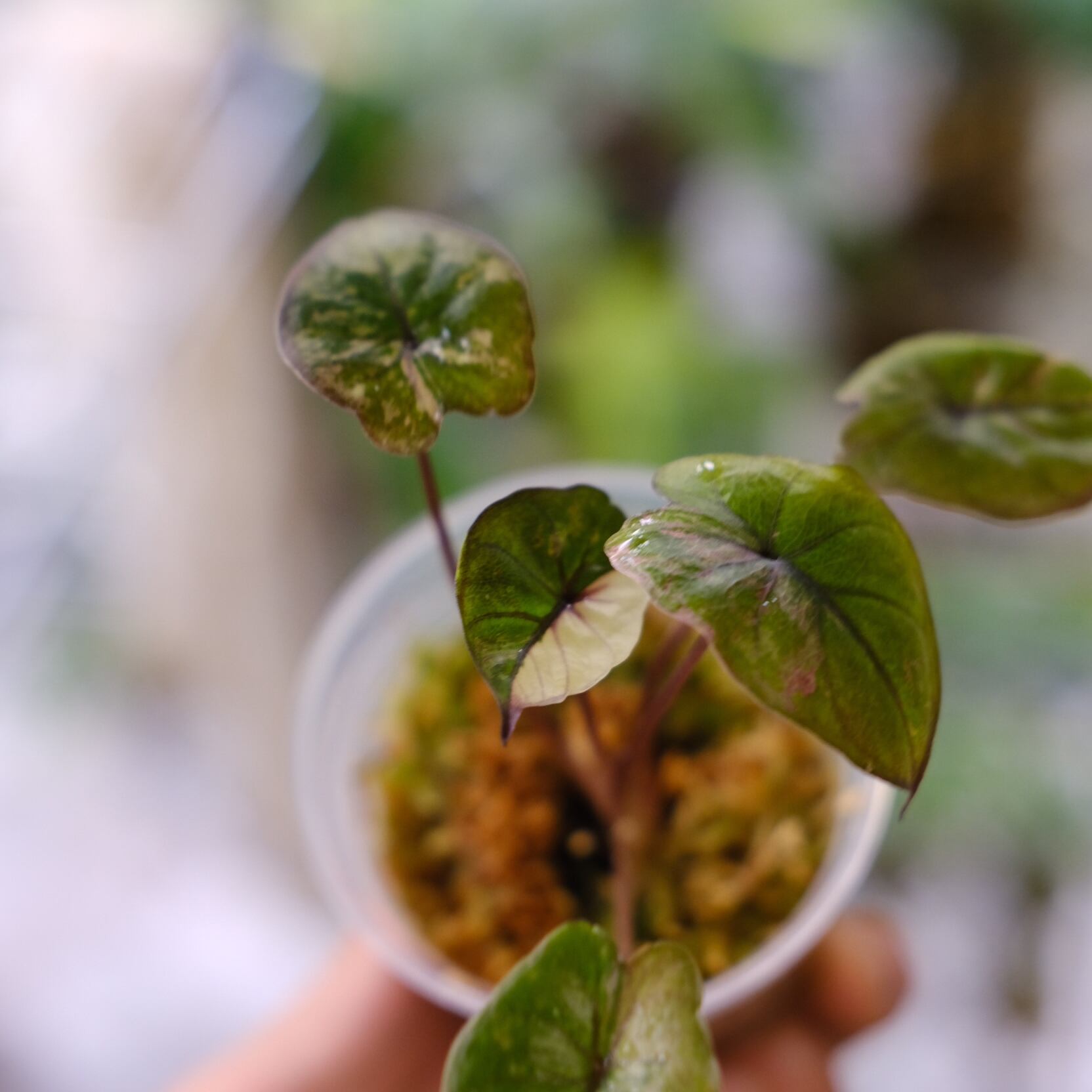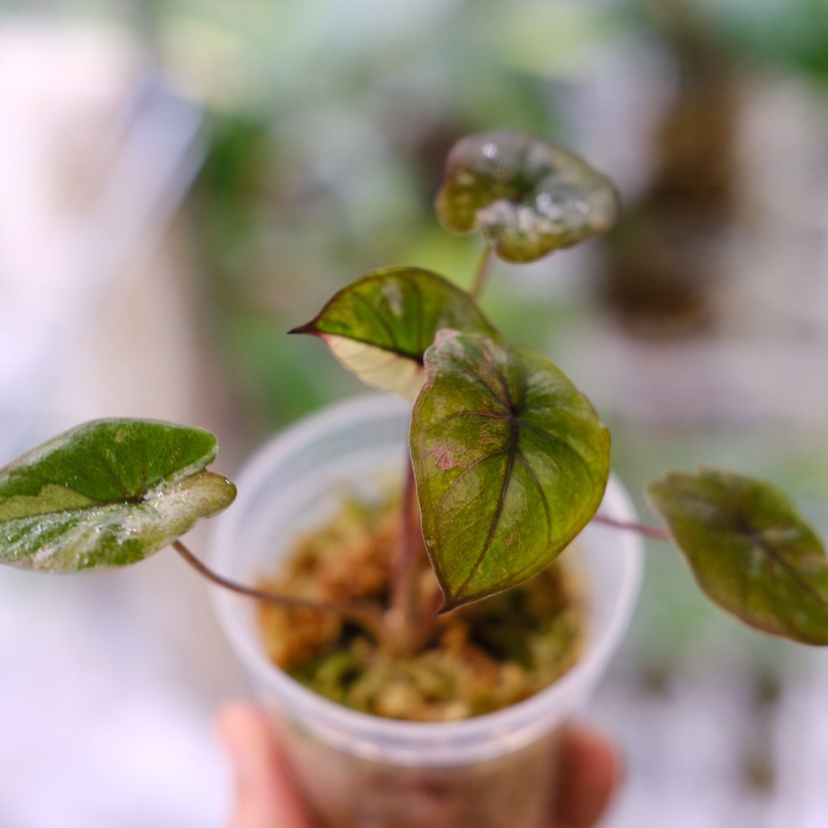 人気のアロカシアの中でもトップクラスに希少な"アロカシア ピンク セレンディピティ"。大きく育つとピンク色の斑がより浮き立ち、高級感漂う見た目に育ちます。斑の色や濃さによっては倍以上の価格で取引される大変珍しい品種です。もうすぐ新芽が展開しそうな健康状態の良い株です。