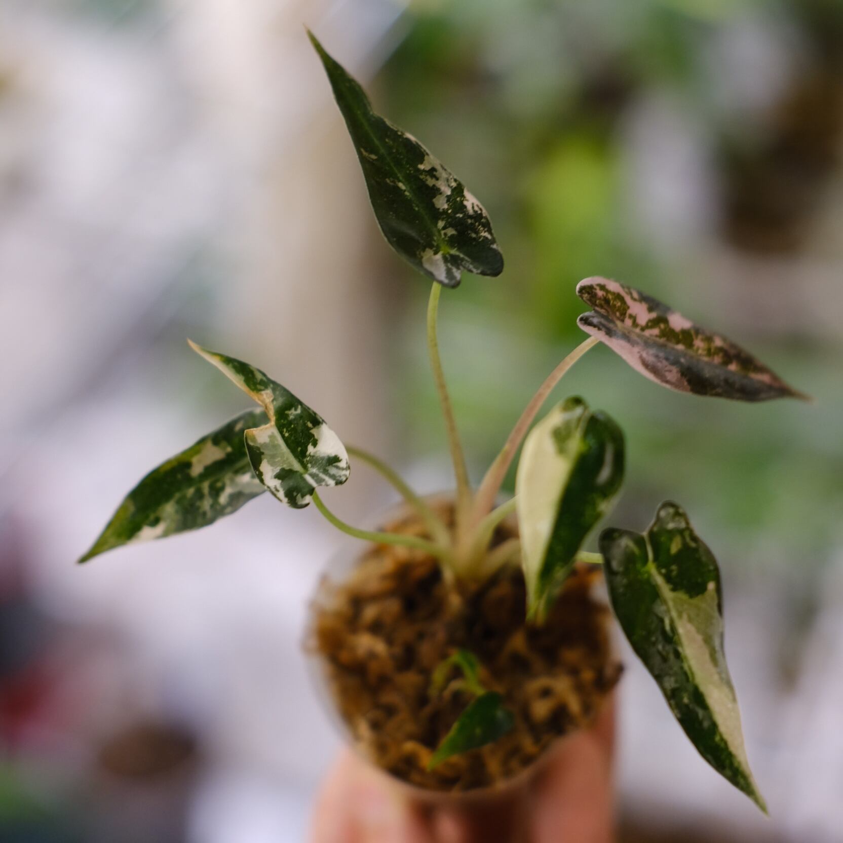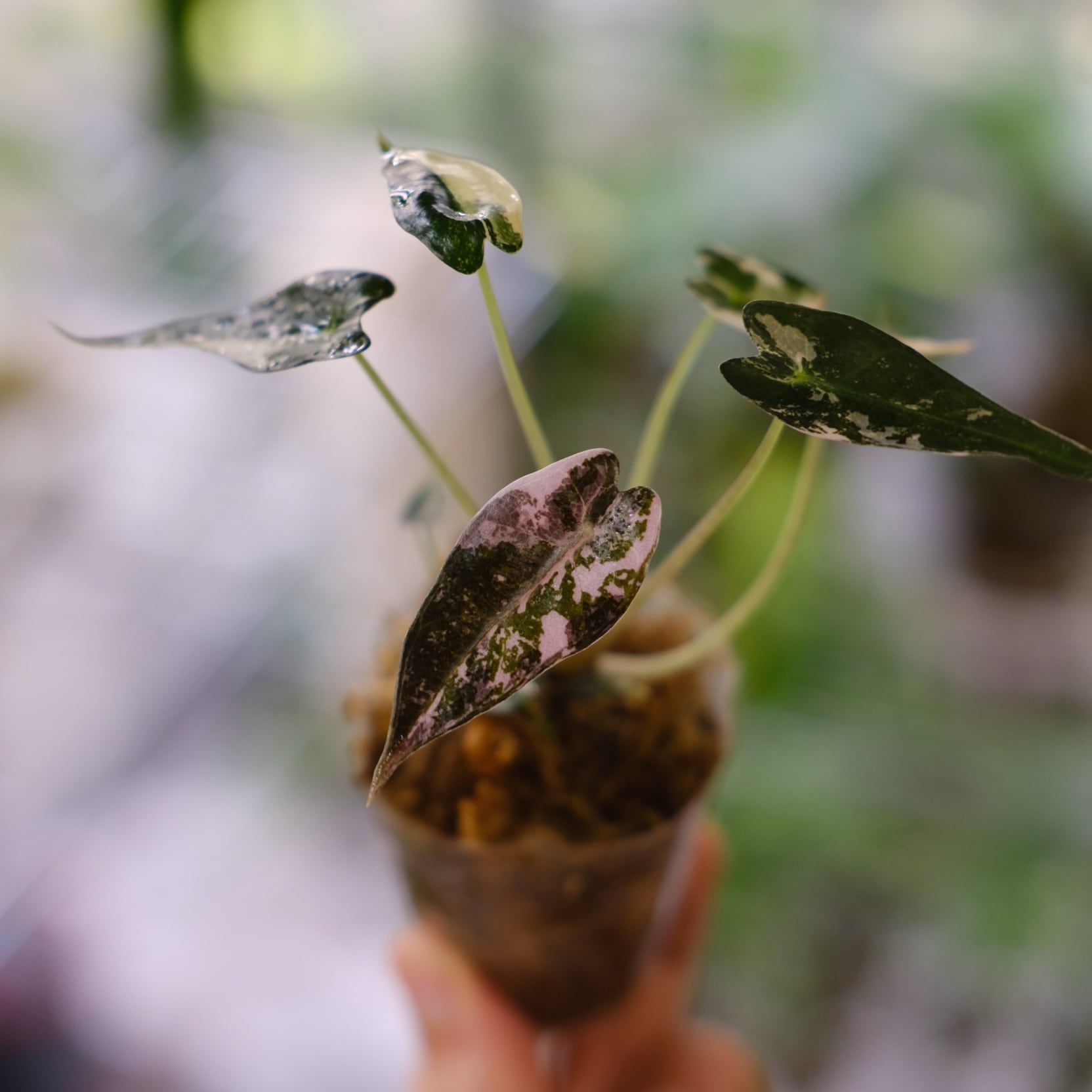 様々なレア品種が存在するアロカシアの中でも特に希少な斑入りの"アロカシア バンビーノ ピンク" です。 組織培養株のため大きく育つとピンク色の斑が強くなり、高級感漂う見た目に育ちます。