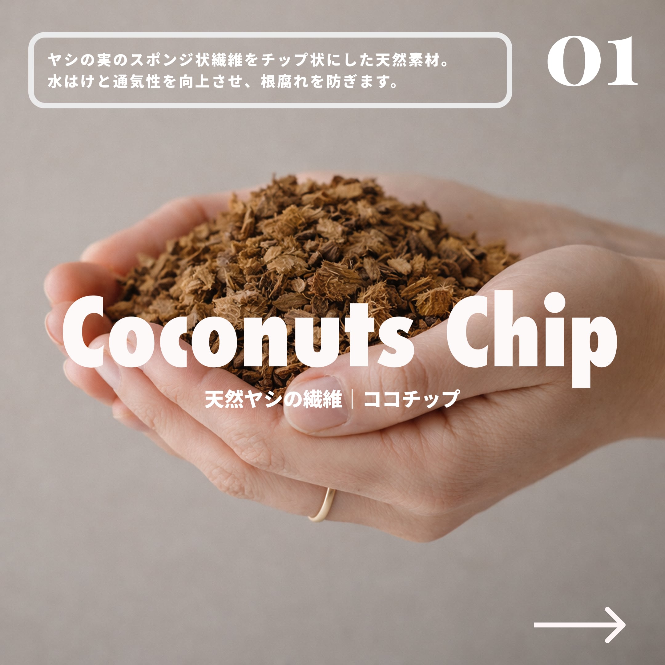 ヤシの実のスポンジ状繊維を特殊加工によりチップ状にした天然素材。水はけと通気性を向上させ、根腐れを防ぎます。