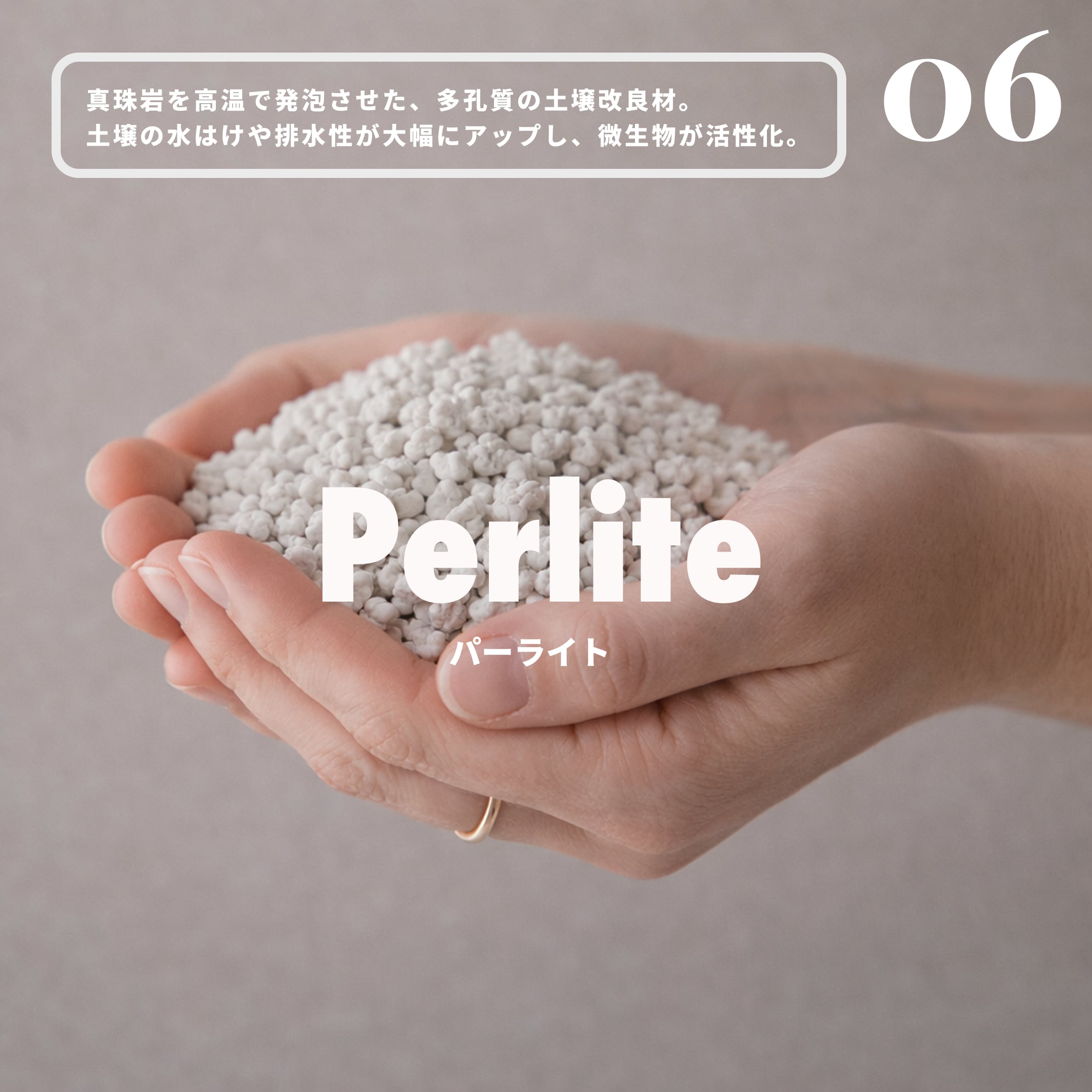 真珠岩を高温で発泡させた、多孔質の土壌改良材。非常に軽いため、土壌の水はけや排水性が大幅にアップし、多孔質のため、通気性が改善され微生物が活性化します。