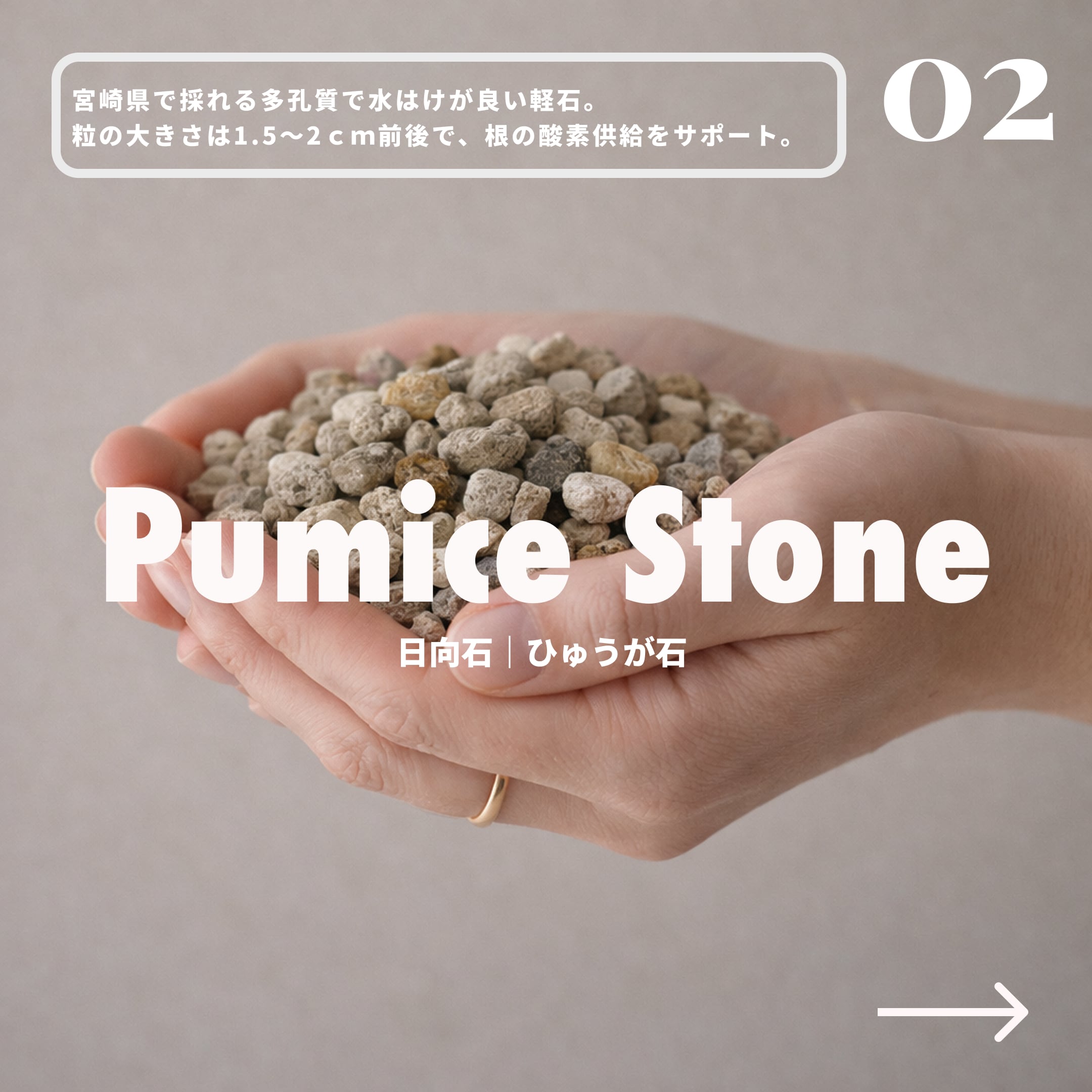宮崎県で採れる多孔質で水はけが良く適度な保水力も備えた軽石。粒の大きさは1.5~2cm前後で、根の酸素供給をサポート。