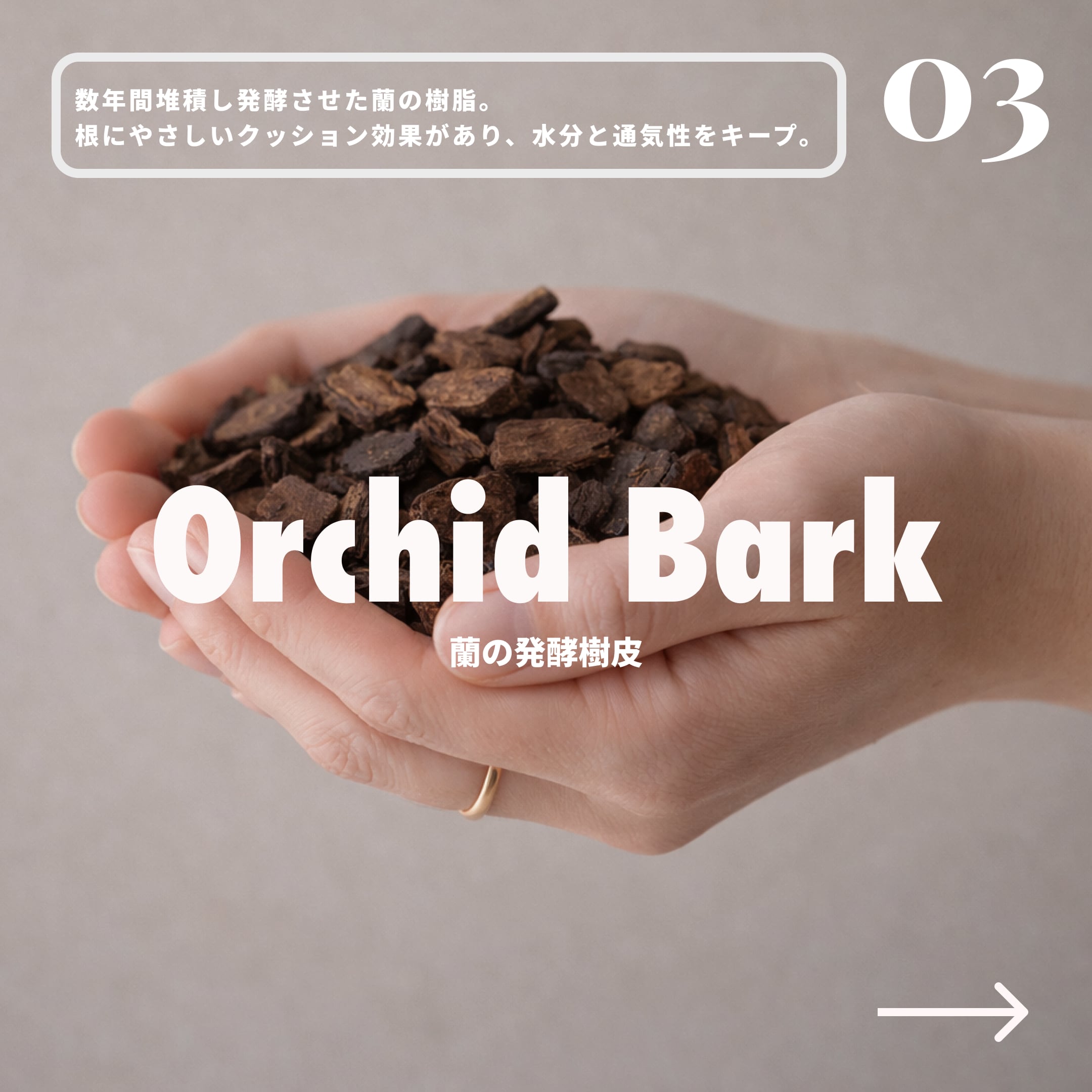 蘭の樹皮を主原料とし、数年間堆積し発酵させた特殊バーク。腐植を多く含み、根にやさしいクッション効果。水分を保持しながら通気性もキープ。