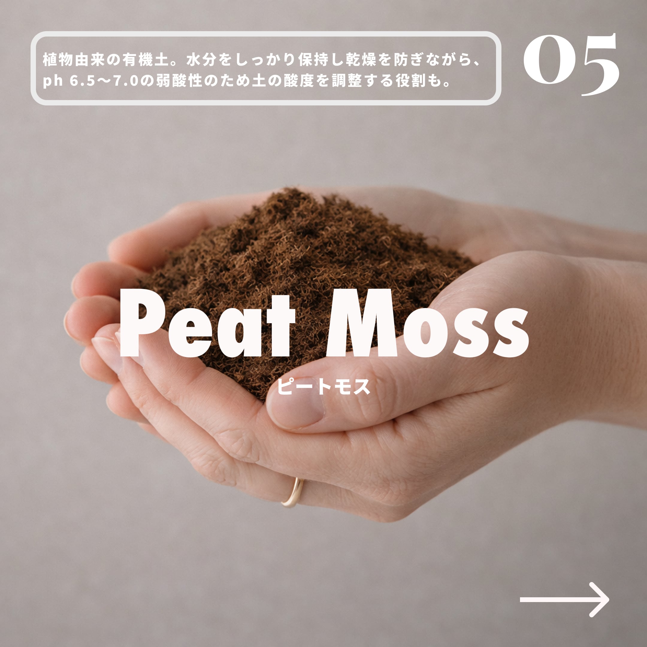 寒冷地の湿地帯に繁っていた水苔が、長年にわたって堆積・分解した植物由来の有機土。水分をしっかり保持し乾燥を防ぎながら、6.5~7.0の弱酸性のため土の酸度を調整する役割も。